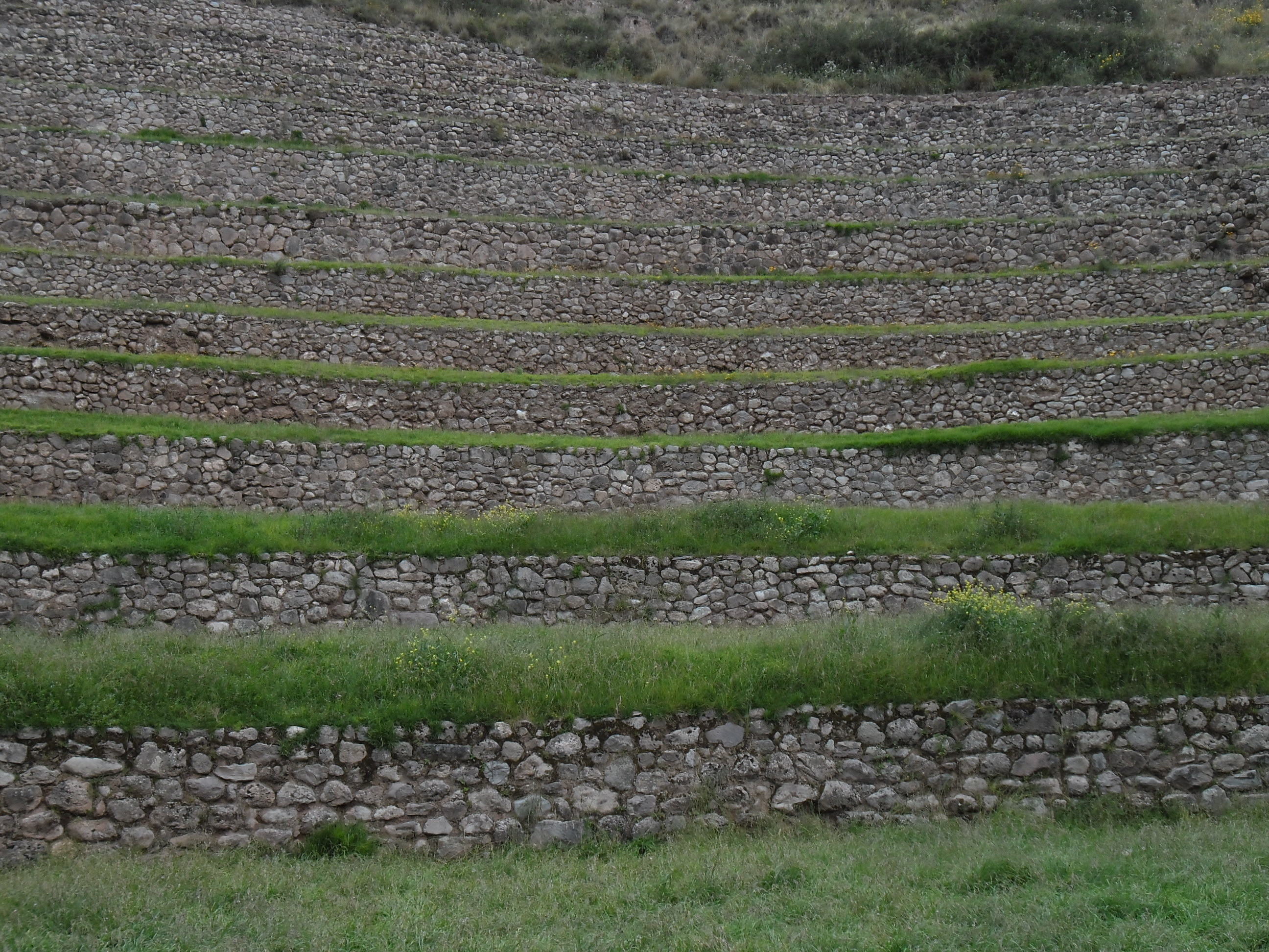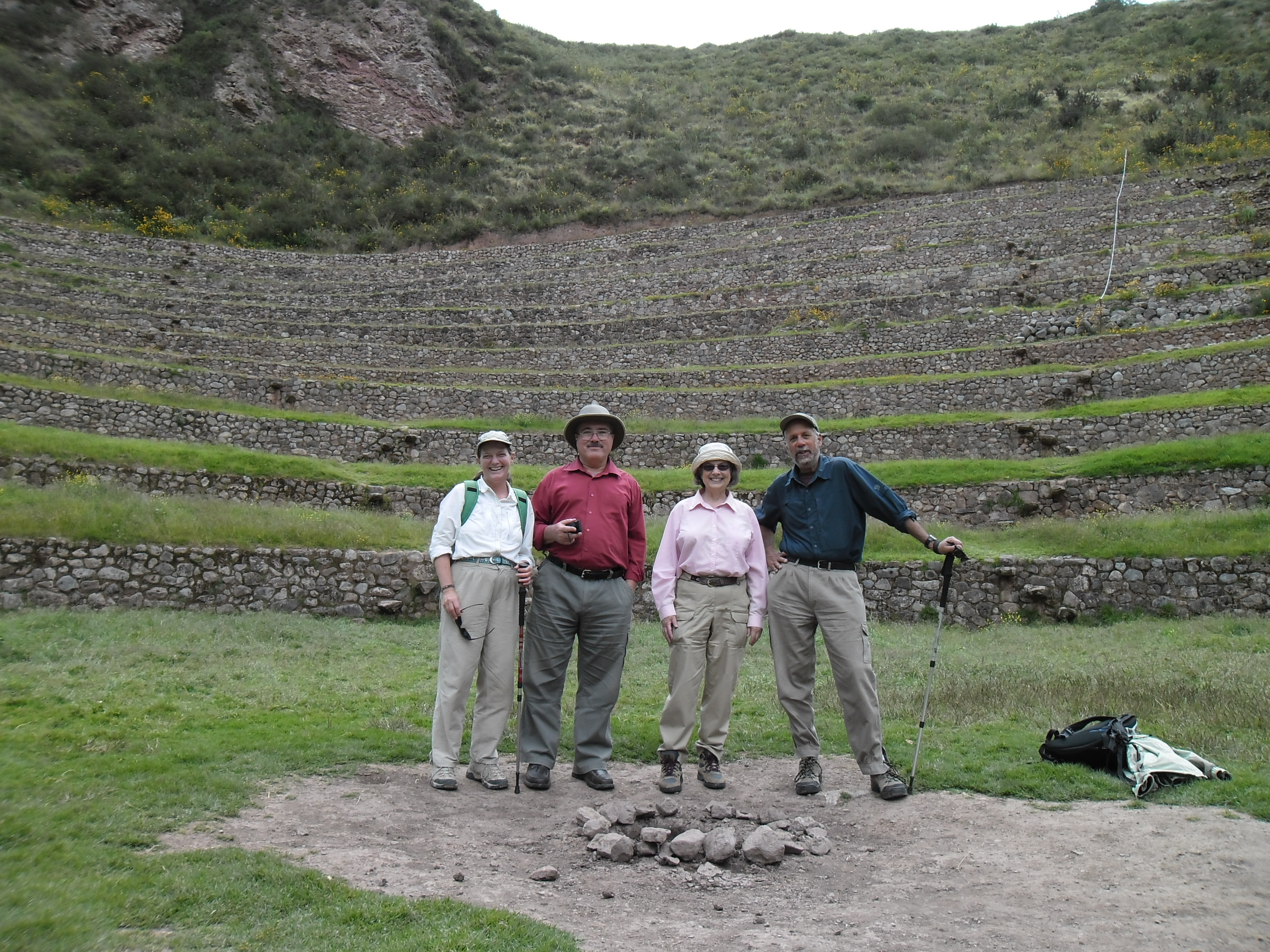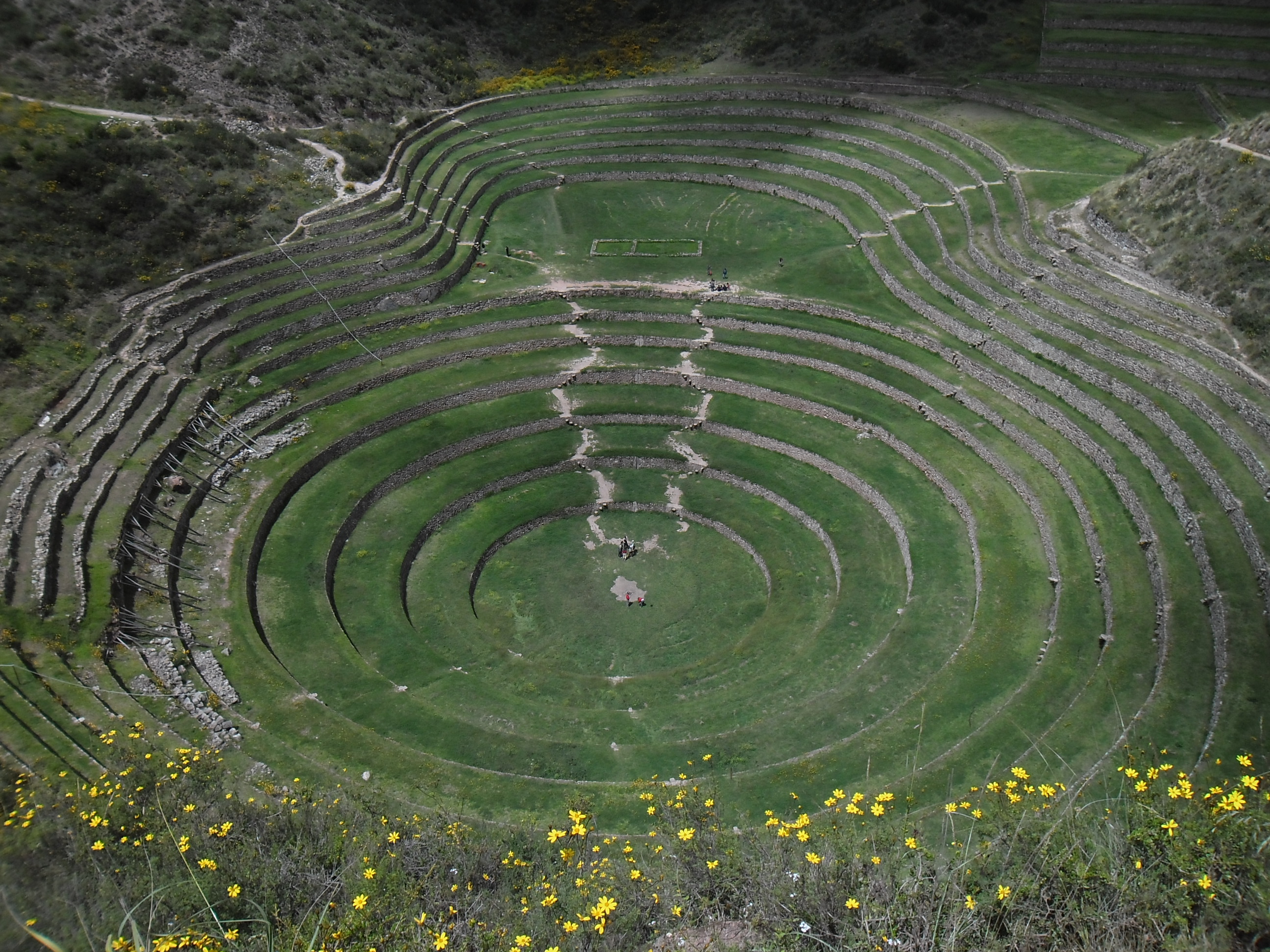 About an hour drive from Ollantaytambo is an archaeological site named Moray. This site is a spectacular illustration of the Incas´ forward thinking and their priorities for the common good. Moray is located at 11,000 feet of elevation, and it was used as a laboratory for growing corn seeds that would produce corn at varying elevations. They built terraces in concentric rings, down in a depression, which varied in temperature, according to elevation and sun angle. They grew different seeds on different terraces of different temperatures, then they took those seeds to areas that duplicated the conditions. Using this method, they developed seeds that were resistant to frost, and that would grow in limited sunlight or full sun, and they took those seeds and planted them in the best sites in the Andes.