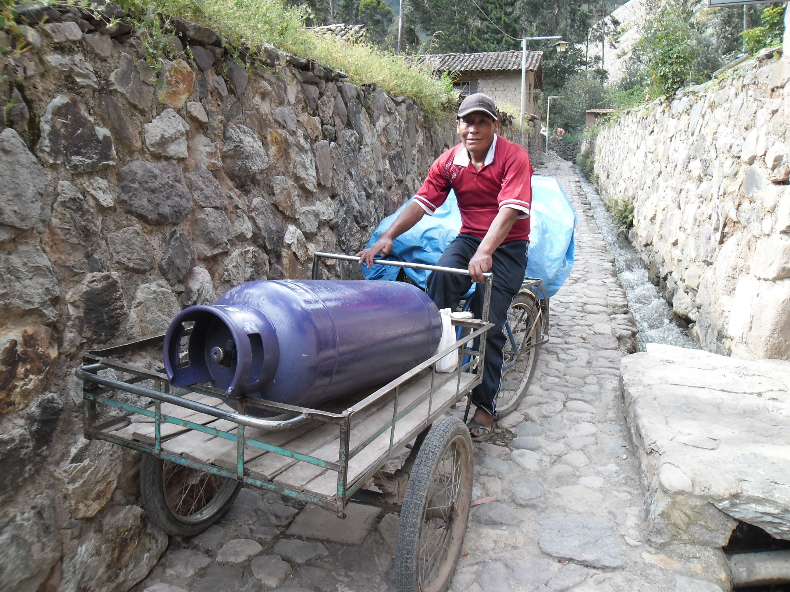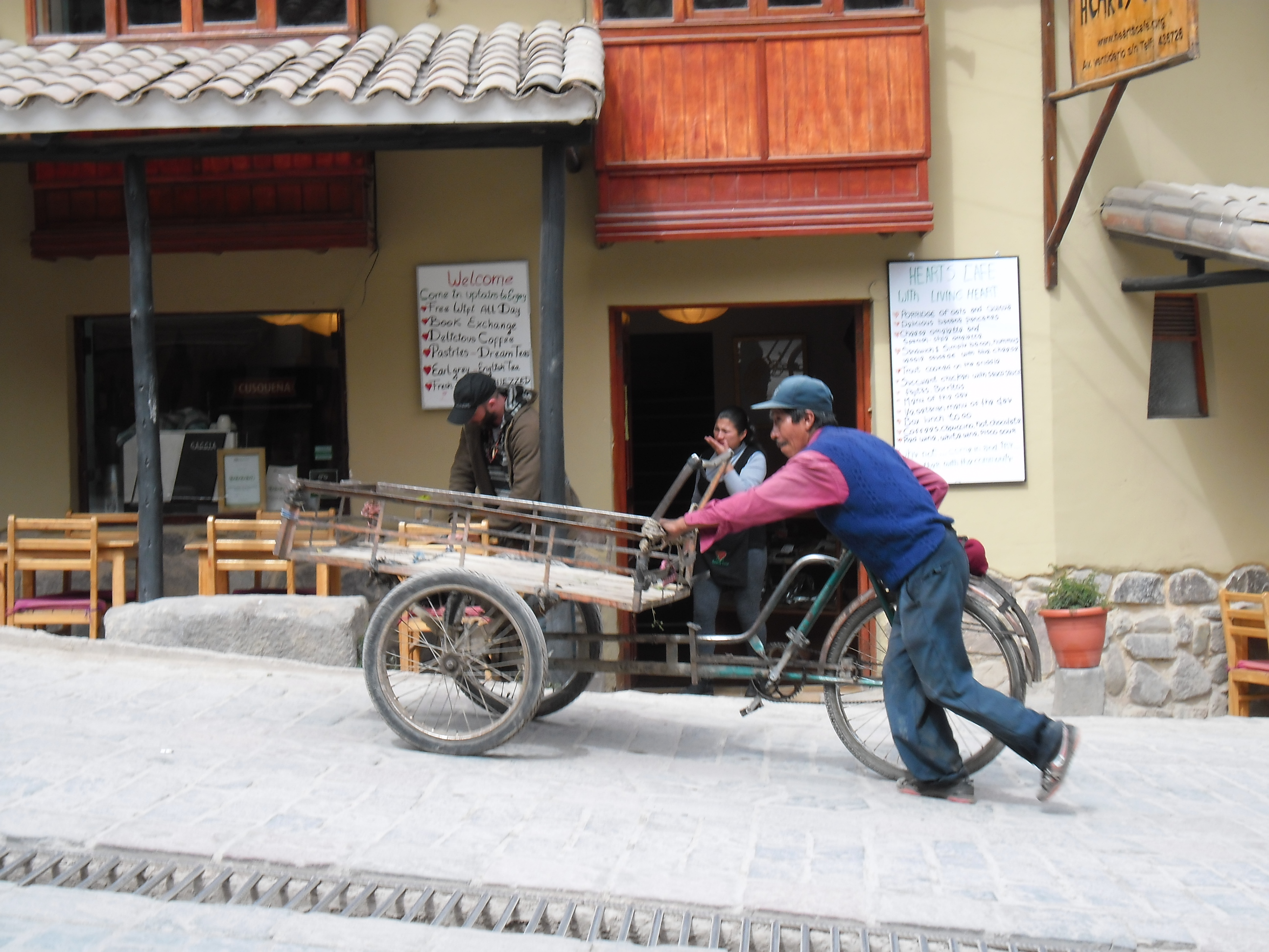 SAM_0296SAM_0297The water that’s running alongside the road is the original Inca irrigation canal. The water comes from up high in the mountains. When we need to get a delivery that’s heavy, people use tricycles to carry the load. There are lots of tricycles in town, most of them missing pedals, a lot of them missing seats. Here is Mateo, the guy who delivers gas tanks for heating water, delivering a tank to the lodge.