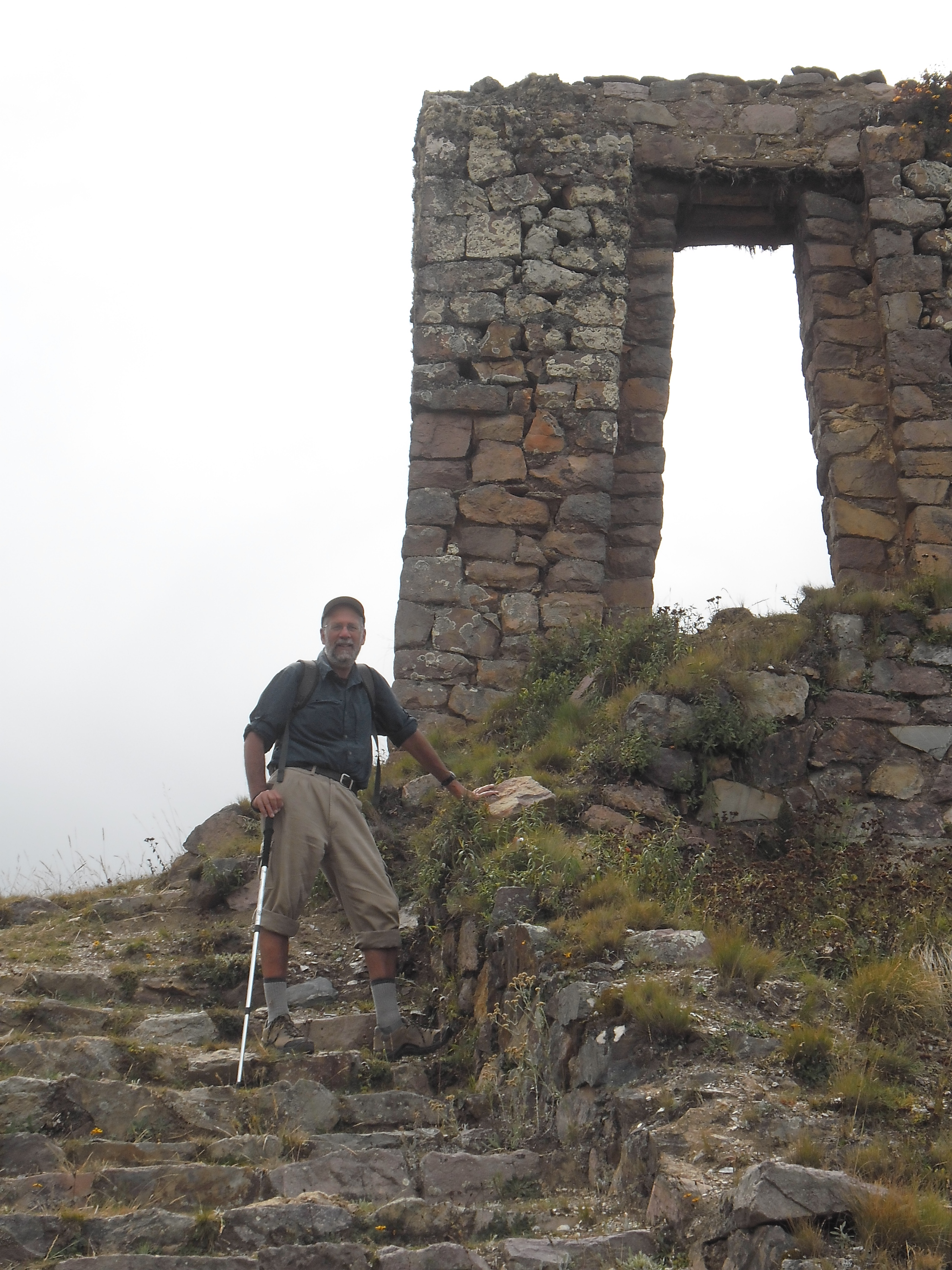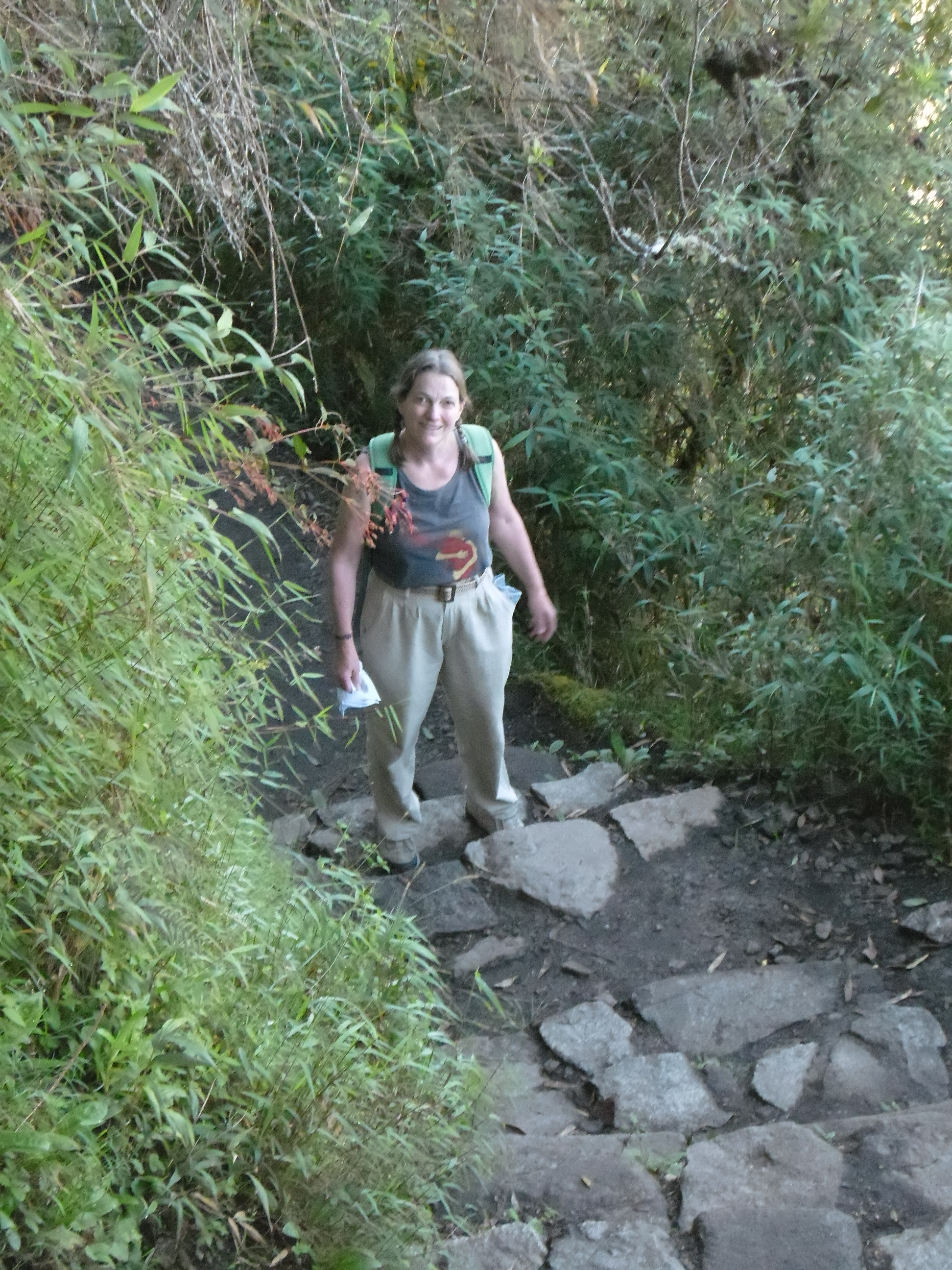 The most famous sun gate is at Machu Picchu. It frames Huaynapicchu. There is also a sun gate near Ollanta. It´s about ten kilometers from the town square, which makes it a twenty kilometer hike. You leave the town square and walk down to the river, then along the river for a while before the trail starts to climb. In all, there is a 3500 foot elevation gain from town up to the gate. The gate is about 12,400 feet above sea level, and it took us six hours of steady ascent to get there.