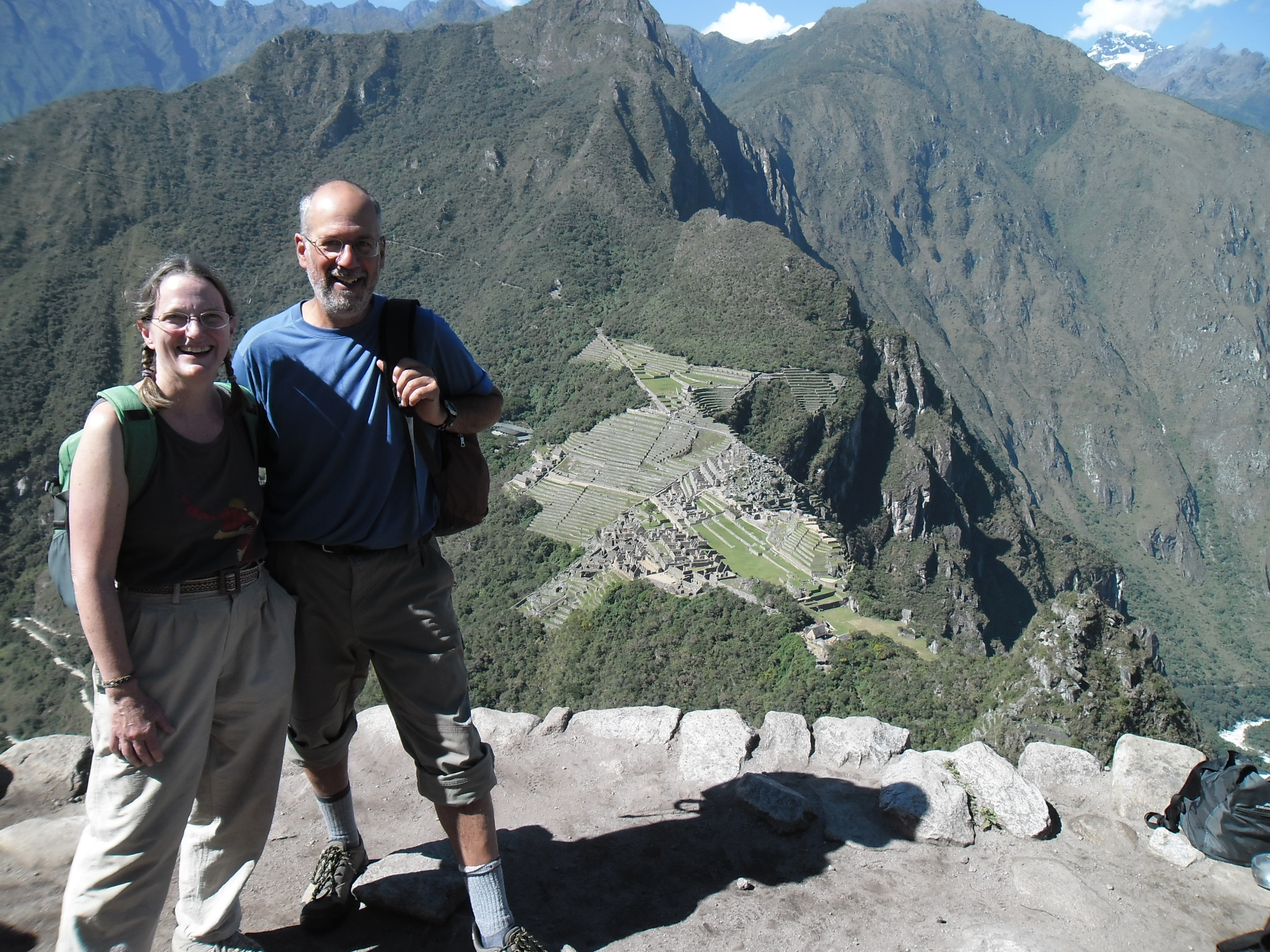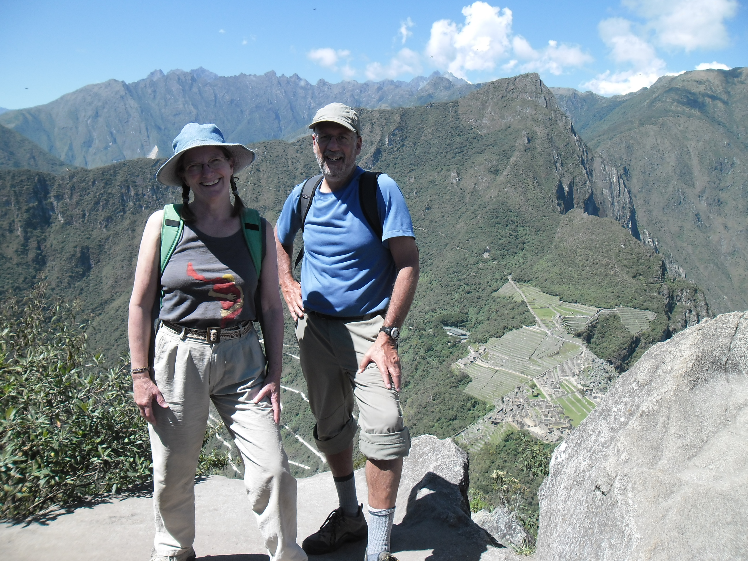 SAM_0673SAM_0633There are many ways to get to Machu Picchu. Lots of people choose to walk there on the Inca Trail. To do so, you must go in with a group, with a registered guide. It’s either a four-day or a five-day trek. Your choice. The hike takes you up and down, through mountain passes and valleys, and is one of the “to do” treks on the list of world trekkers. Arriving at Machu Picchu on the Inca Trail is arriving as the Incas arrived. Exhilarating.. Monica and I chose to take a train, then a bus. We slept in Aguas Calientes, the town at the base of the mountains. We set our alarm for 5:00 in the morning, left the hotel in the dark, and walked to the bus stop. The buses were already rolling, and there were a couple of hundred people waiting in line. Machu Picchu is the premier attraction in South America. It’s a dream of millions of people to come here. We’re glad we made it.