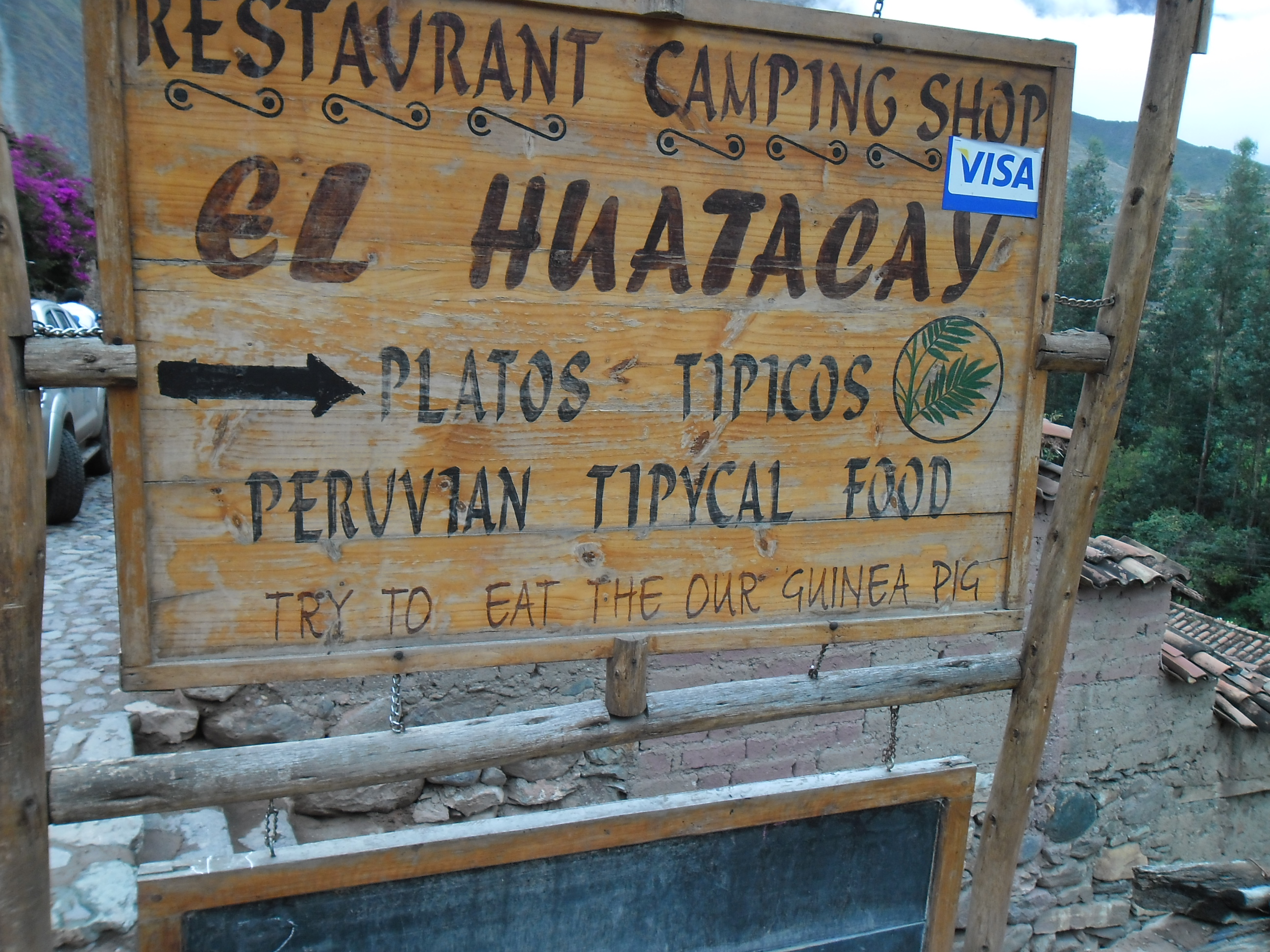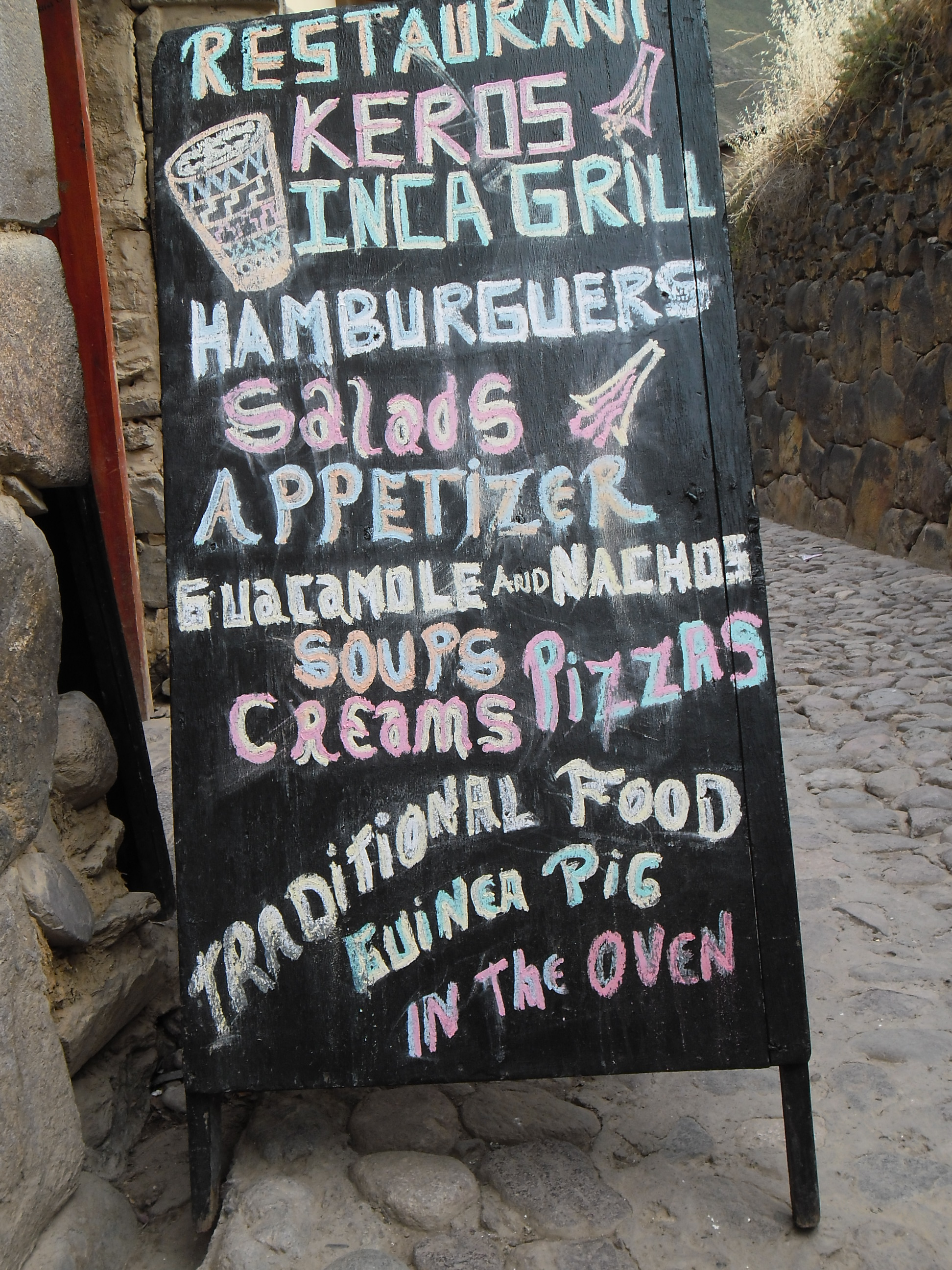 The plaza is a very lively and friendly place. A perfect place to hang out in the afternoon. The streets of Ollanta are also friendly and interesting. Some of the restaurants have their menus outside, and some of them try to entice the tourists to try some cuy. Cuys are definitely guinea pigs. They´re all over, and they actually have a good life, up until the moment.