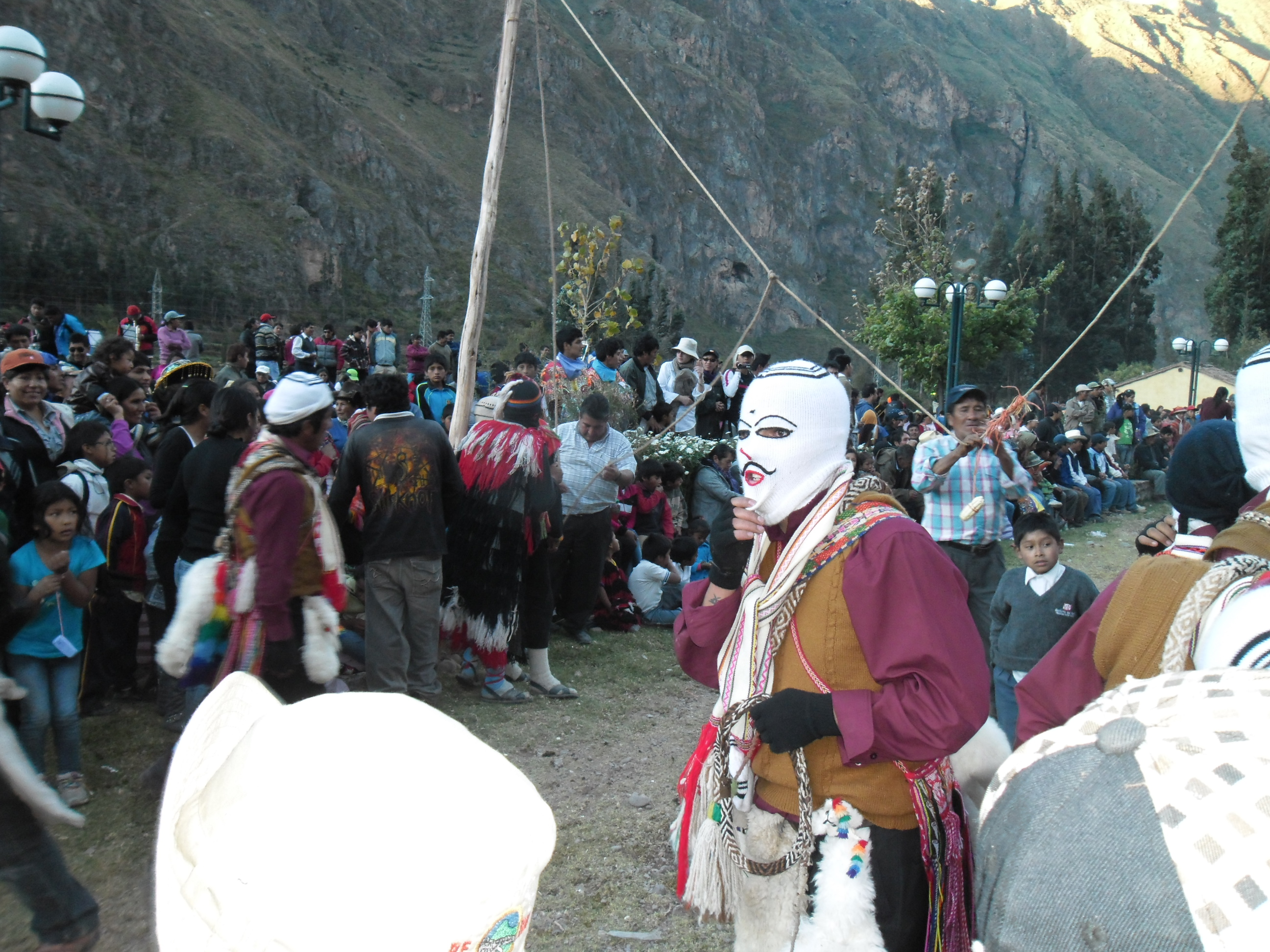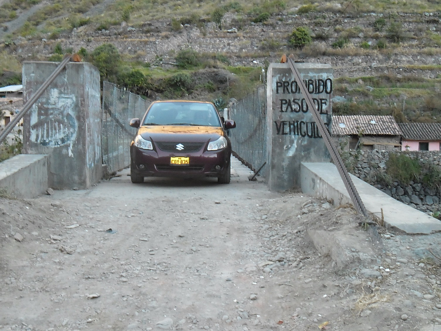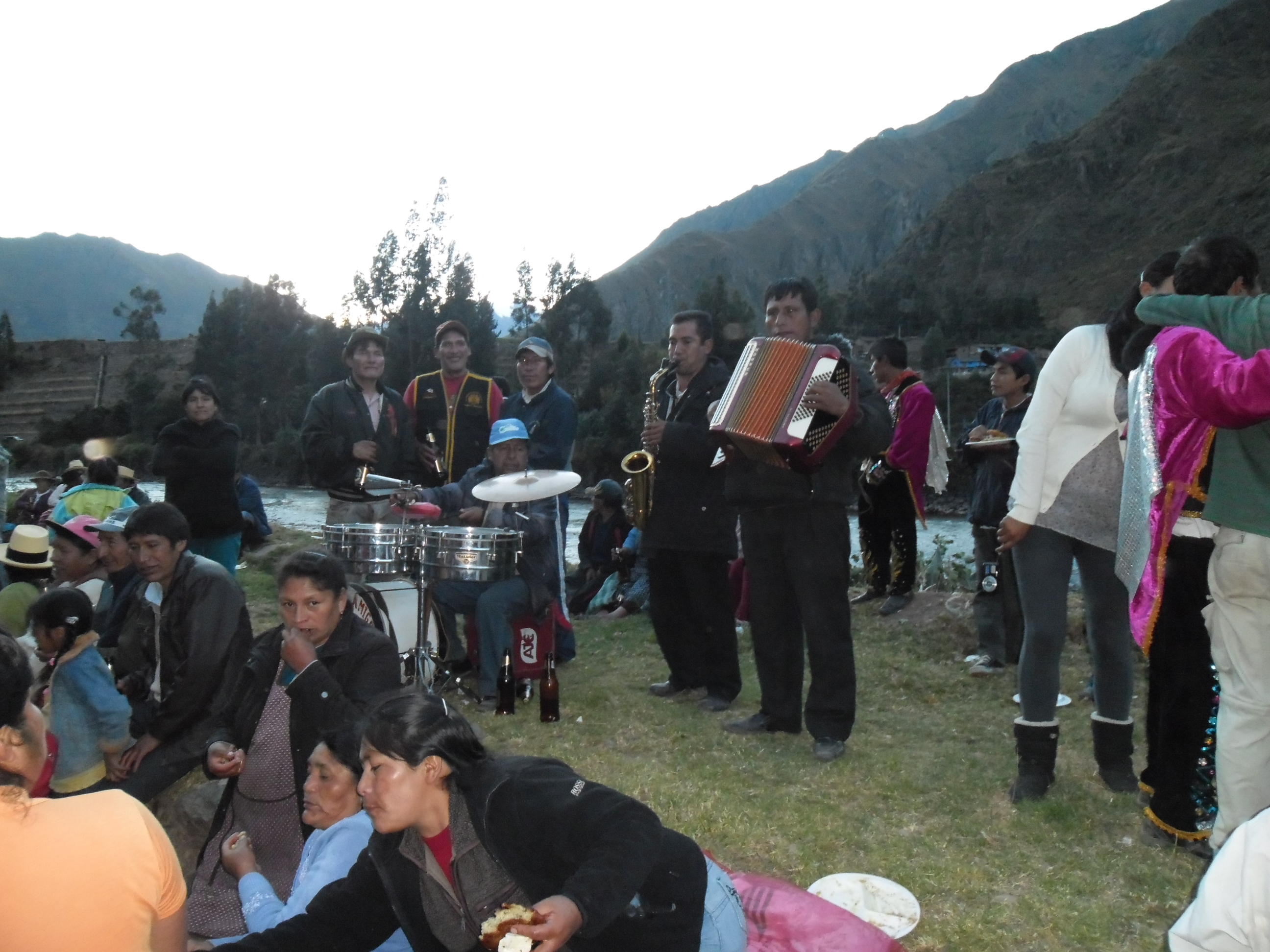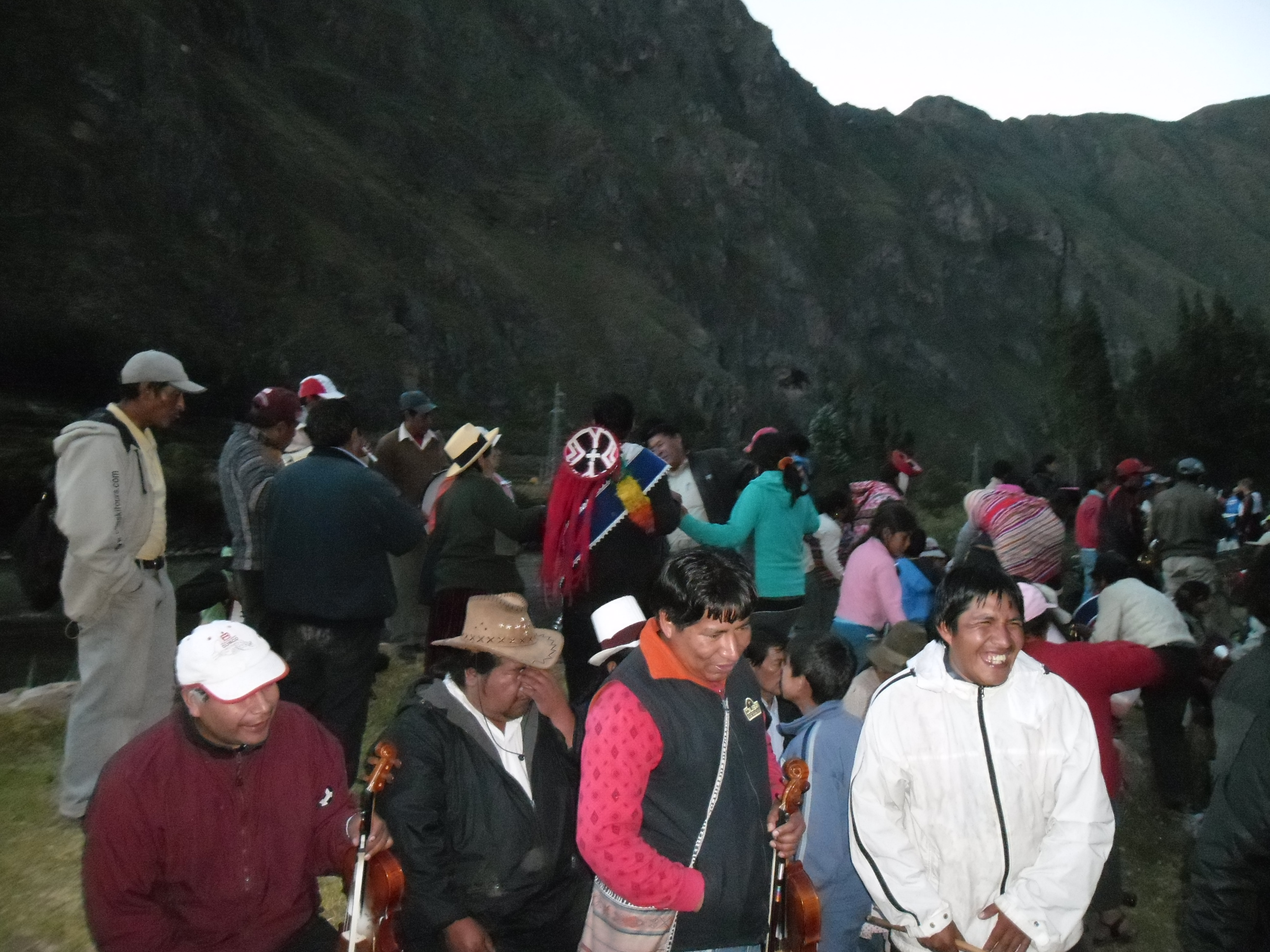 SAM_1020The final night of the fiesta was especially exciting. All the dance troupes, all the musicians, and I think everybody in Ollantaytambo left town in the late afternoon, and went across the river to a still smaller town to set up food and drink places by the riverside, to play music, to dance, and to celebrate the celebration.  We went there with Karina, a friend from the hotel. It was as if everybody was finally relieved of all the tension of the fiesta, and now it was all about being happy. The place was filled with joy and happiness. Everybody was eating and drinking, but I didn´t see anybody buying or selling anything. There was an abundance to share. We drank some beer and some chicha, and shared some food that Karina´s mom had cooked. Everybody was giving, laughing, and smiling. To get to the party place, we had to cross a little footbridge over the river. It´s prohibited for cars to drive over the bridge, because it´s so rickety. Today, though, there was a steady procession of cars. We walked.