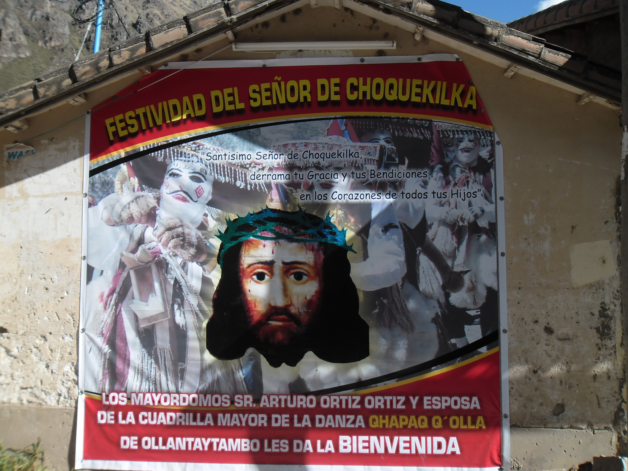 A week and a half before we leave Ollantaytambo, the town threw its biggest party of the year. The party is in honor of the patron saint of Ollanta, named Señor Choquekilka. He´s the protector of the town, the wise being who helps assure that the crops are abundant and the people are happy. Each town has its own saint, and the saints are celebrated on different days in different ways. Ollanta looks forward to its celebration each year. We had heard a lot about the fiesta a long time before it arrived. It´s a four-day celebration, with lots of music and dancing by dance troupes. They set up stages and bleachers in the plaza, and the normally tranquil town square is turned into a noisy, music-filled square, full of parades of dancers and processions with people carrying Señor Choquekilka in and out of the church.