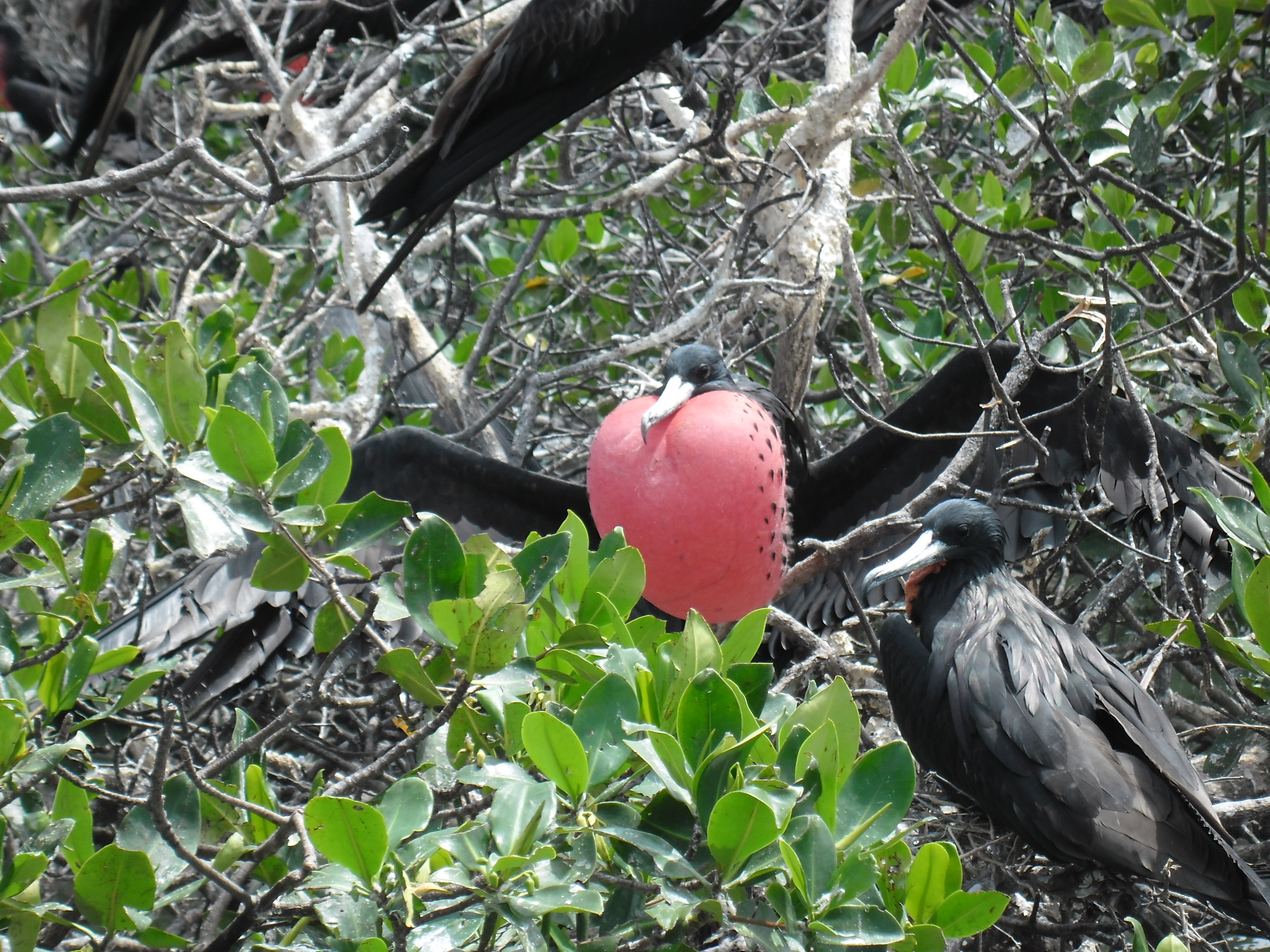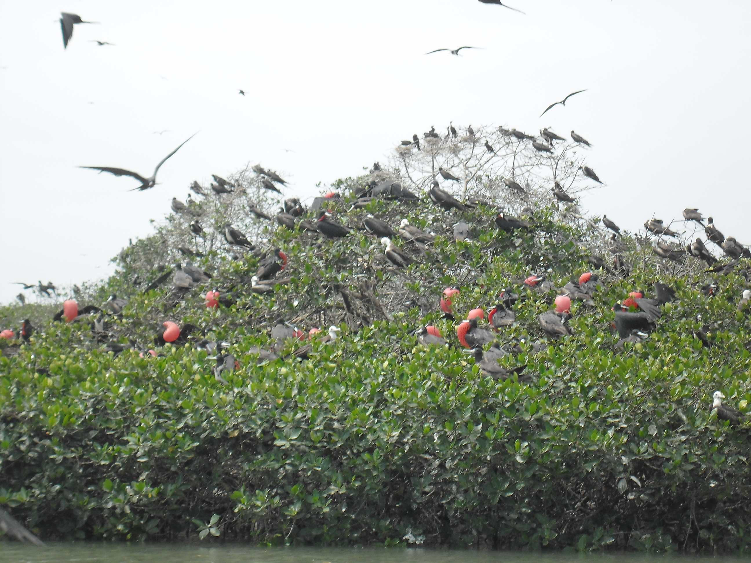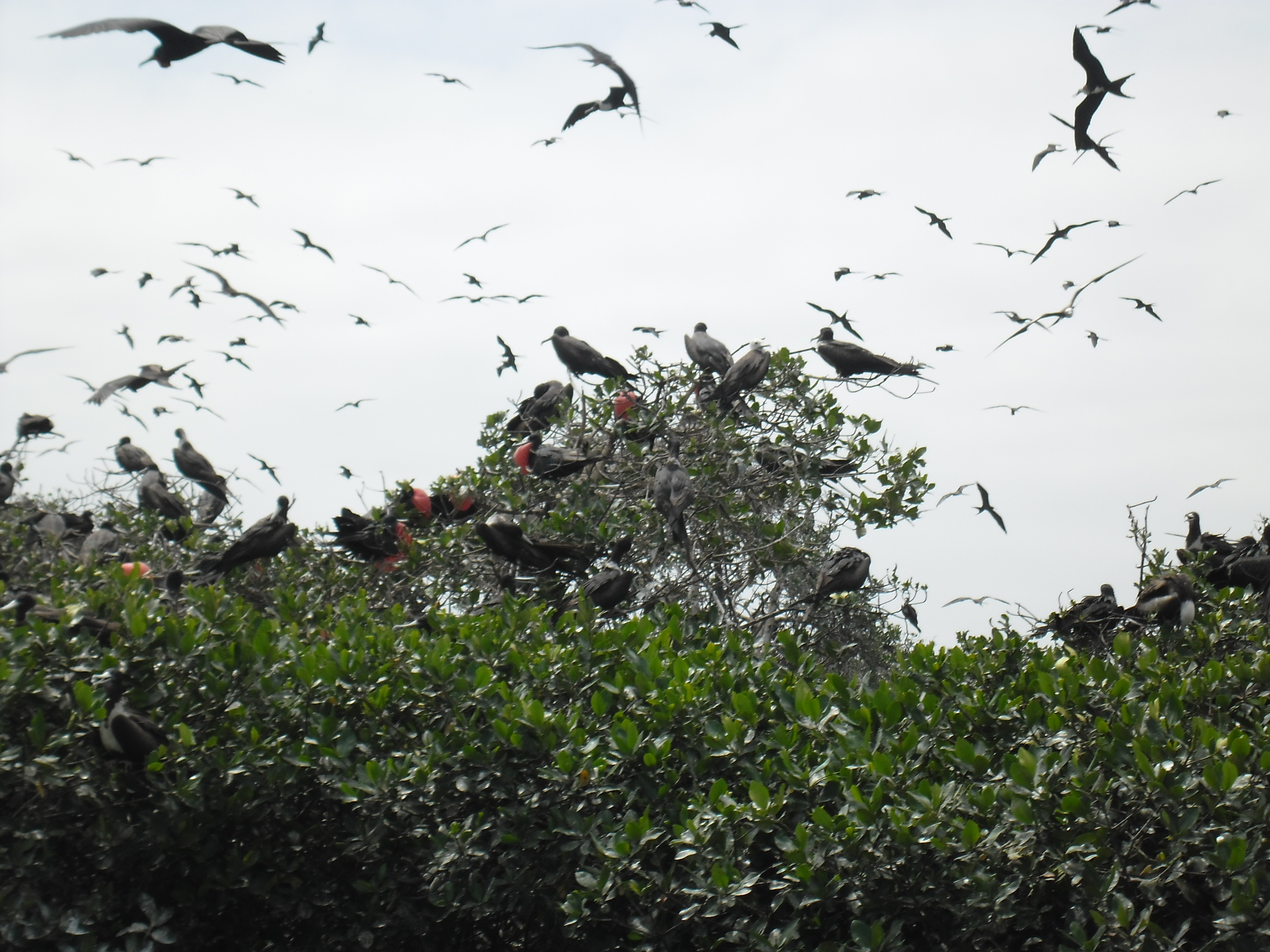 SAM_1141A group of five Australian tourists showed up one day, and all of us went out on an excursion to see the magnificent frigate birds in their nests. The birds truly are magnificent, with a wingspan of six and a half feet, and their ability to soar. They cannot swim, and they never go on land. They soar over the ocean and they skim things off the water. This particular species nests in mangrove trees near the Ecuador/Peru border, and they don’t really wander too far. We drove to Punto Pizarro, then got in a boat, and motored to the mangroves, called manglares. It was impossible to estimate how many birds were there, but my guess was close to one hundred thousand of them. Each pair lays one egg, then the male and female take turns on the nest until the egg hatches. We arrived at the beginning of the nesting season. The males inflate a red pouch on their chests to impress the females. The pouch looks like a red balloon, and it also looks like a heart. We got extremely close to them. Truly a Wild Kingdom outing.