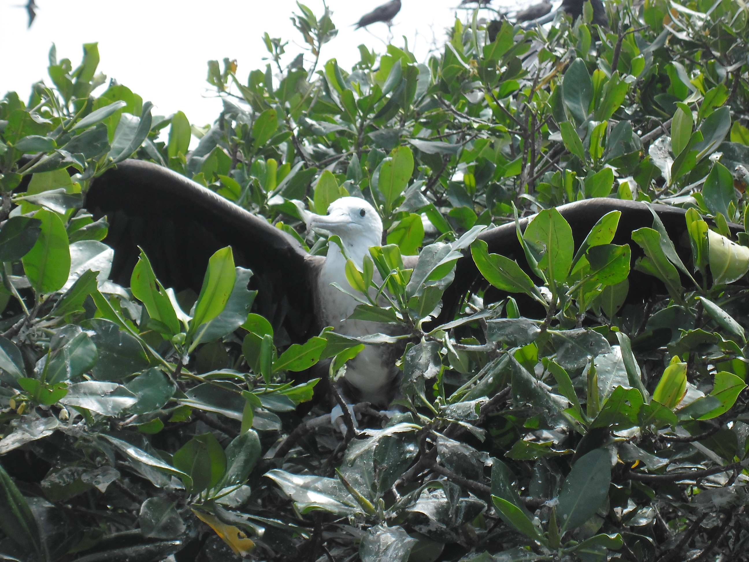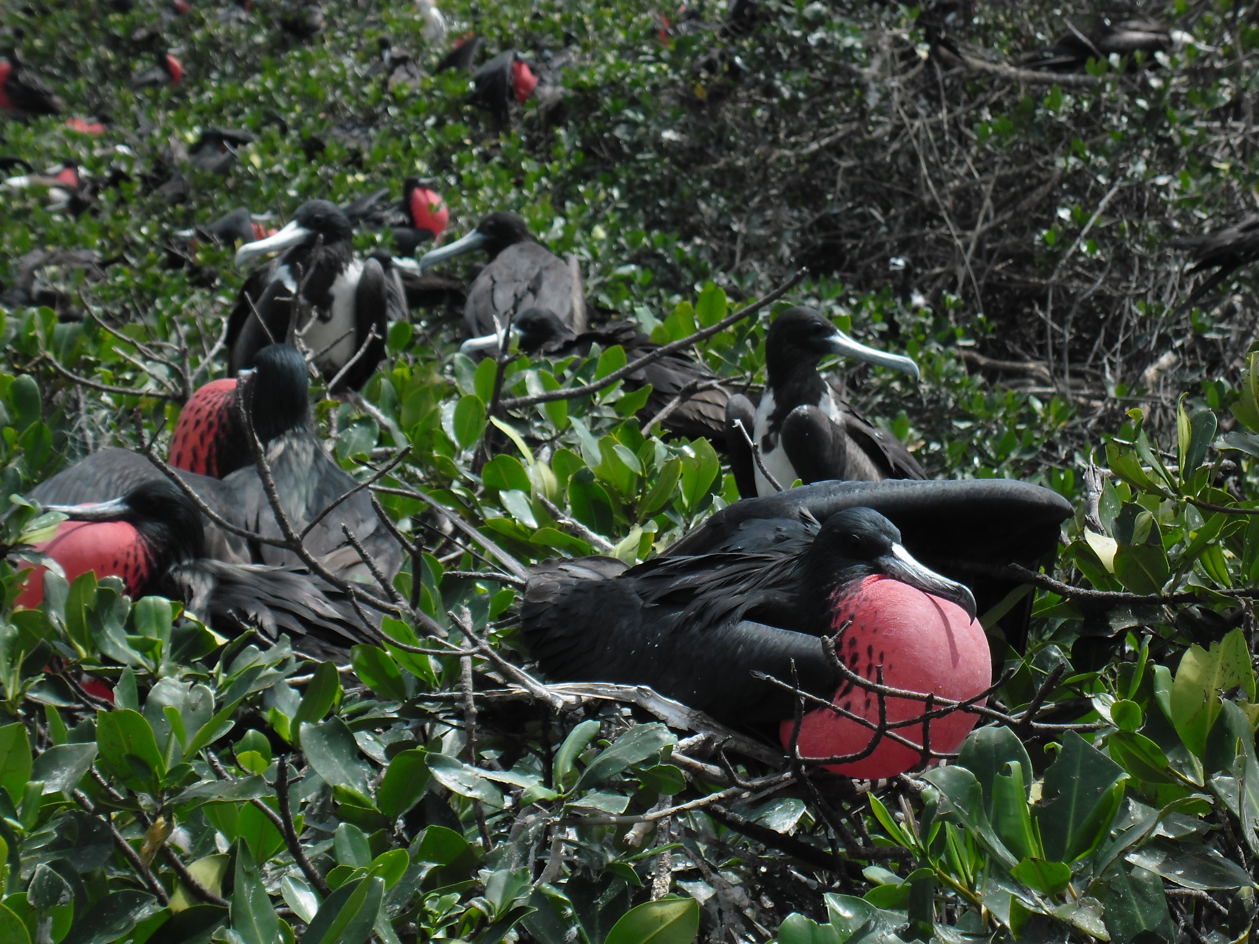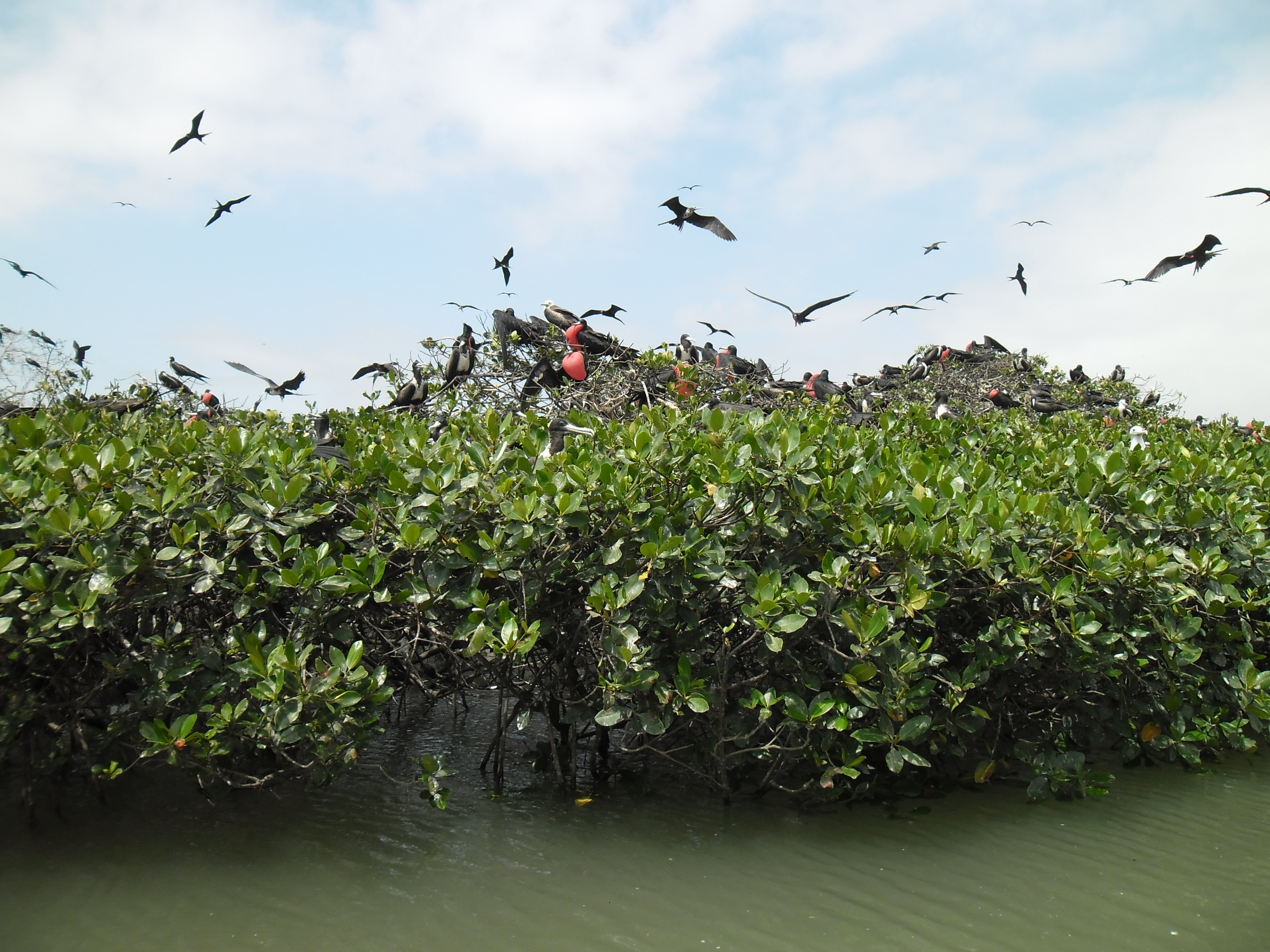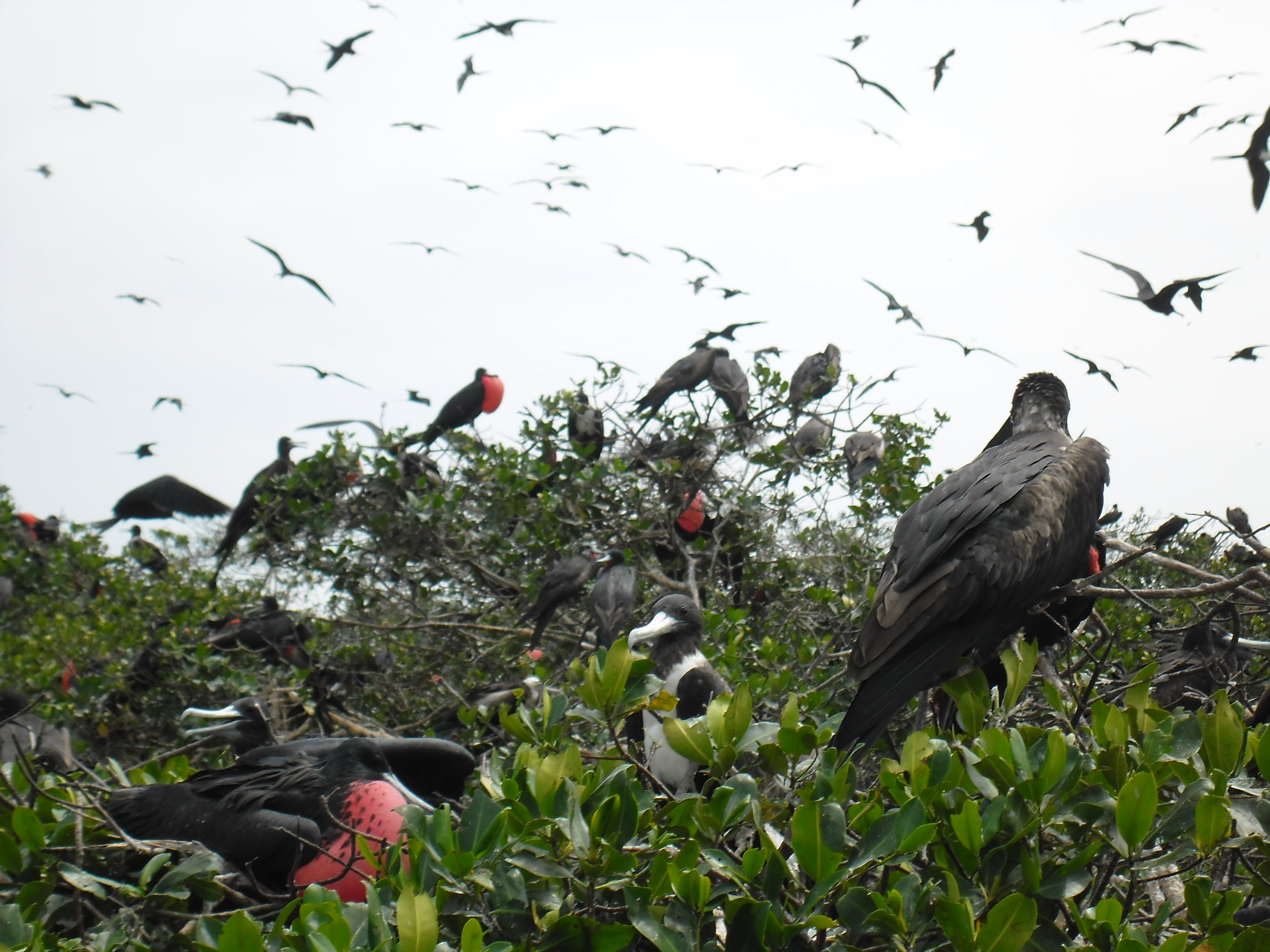 SAM_1141A group of five Australian tourists showed up one day, and all of us went out on an excursion to see the magnificent frigate birds in their nests. The birds truly are magnificent, with a wingspan of six and a half feet, and their ability to soar. They cannot swim, and they never go on land. They soar over the ocean and they skim things off the water. This particular species nests in mangrove trees near the Ecuador/Peru border, and they don’t really wander too far. We drove to Punto Pizarro, then got in a boat, and motored to the mangroves, called manglares. It was impossible to estimate how many birds were there, but my guess was close to one hundred thousand of them. Each pair lays one egg, then the male and female take turns on the nest until the egg hatches. We arrived at the beginning of the nesting season. The males inflate a red pouch on their chests to impress the females. The pouch looks like a red balloon, and it also looks like a heart. We got extremely close to them. Truly a Wild Kingdom outing.