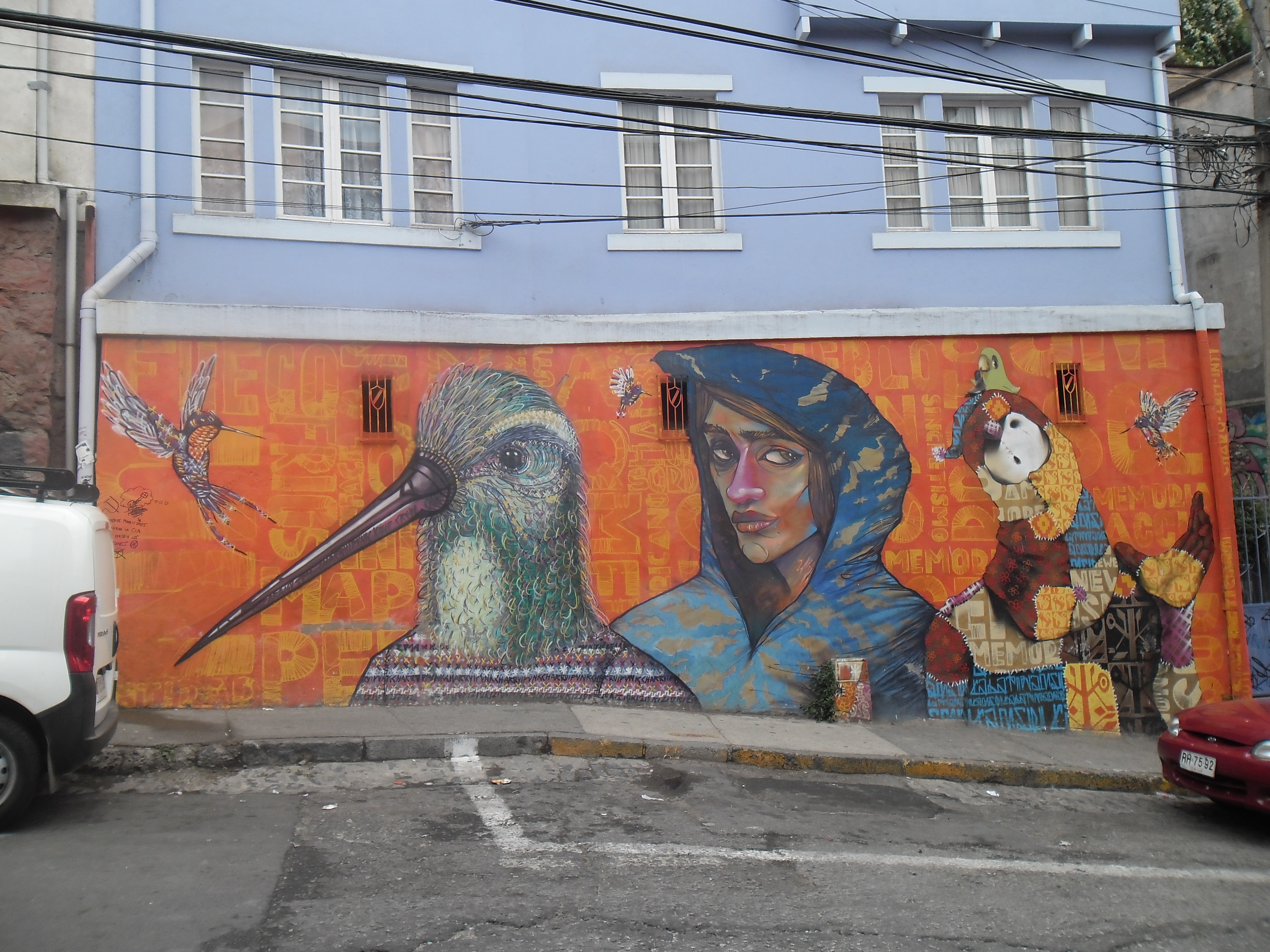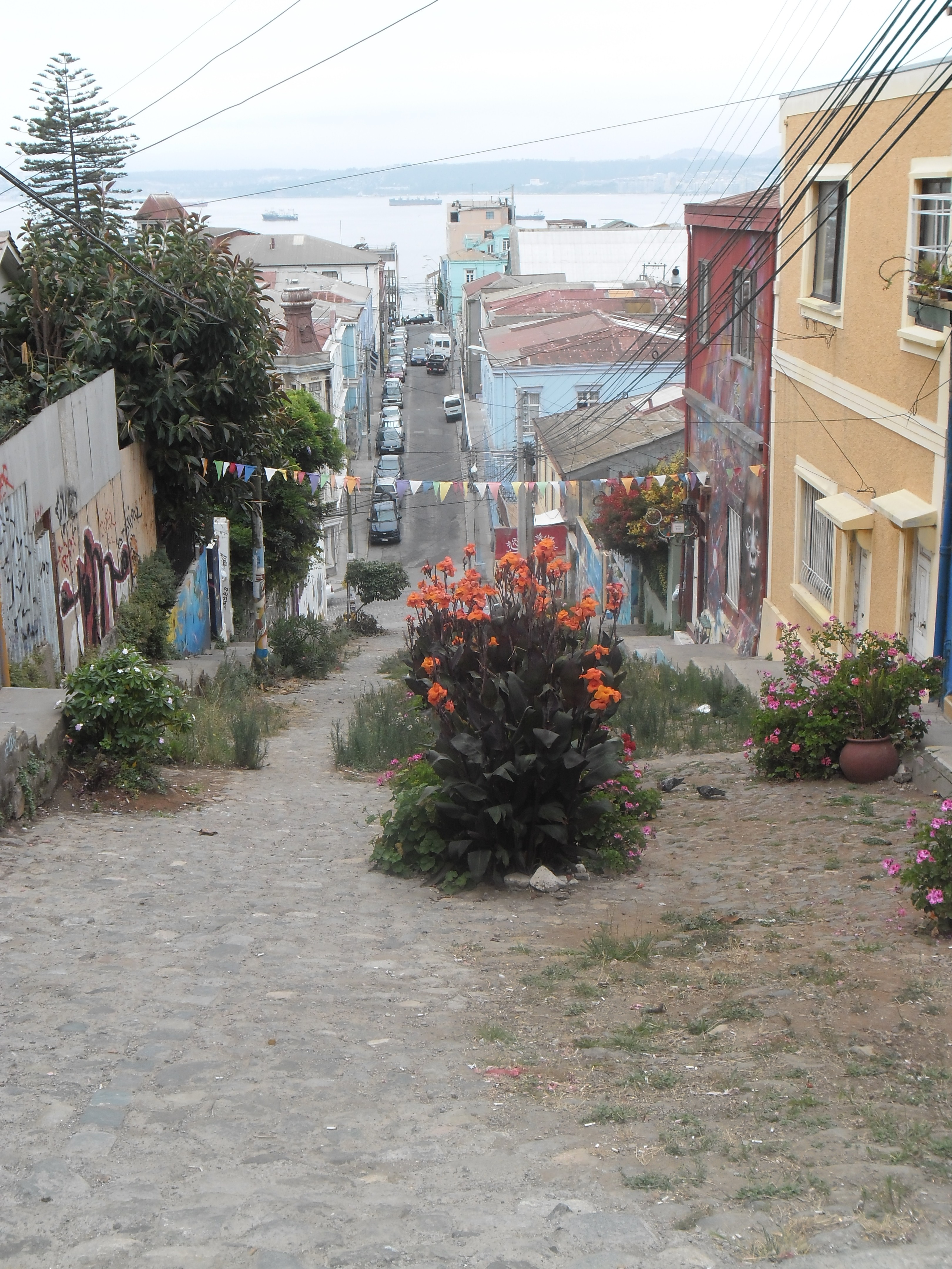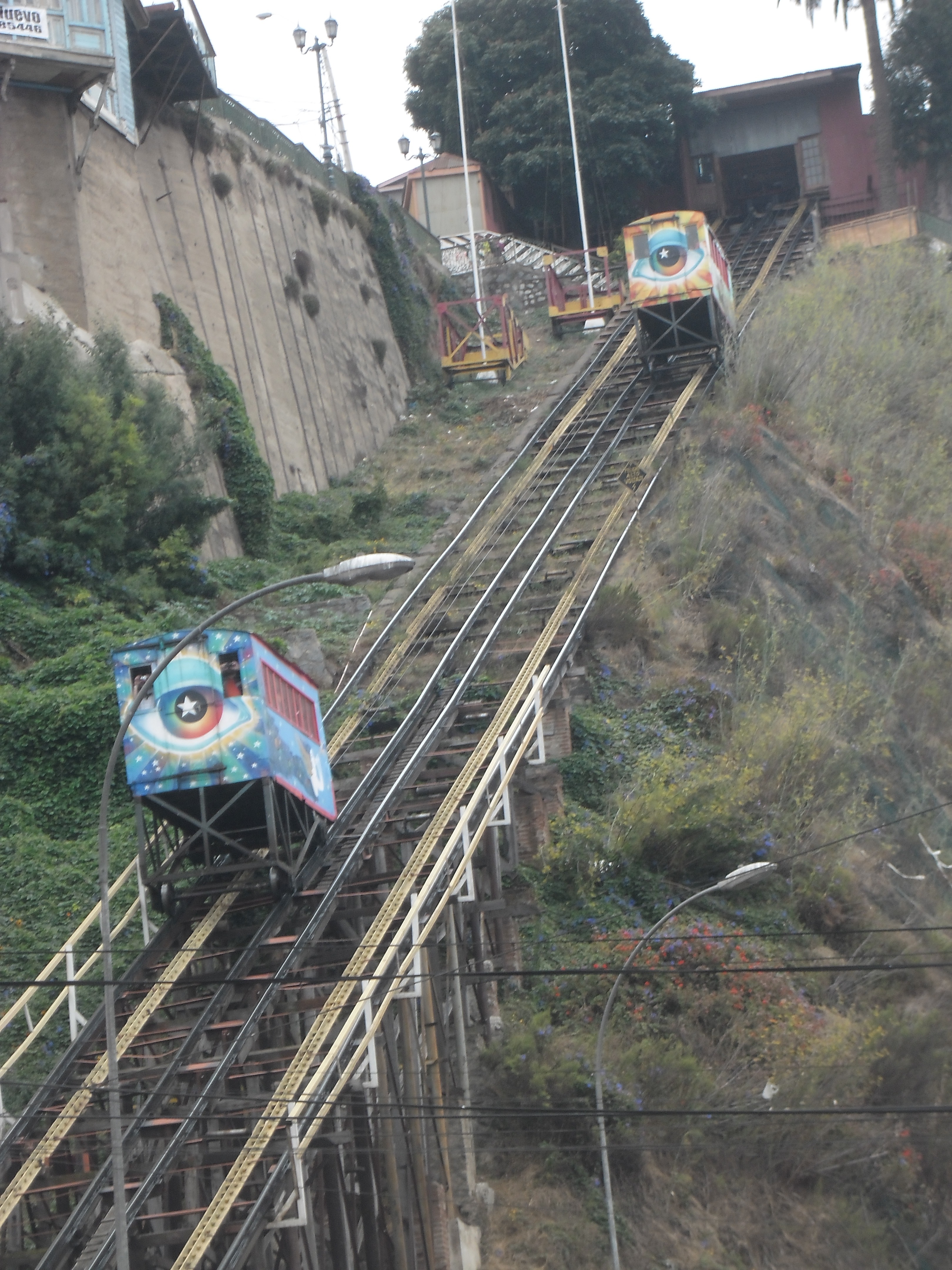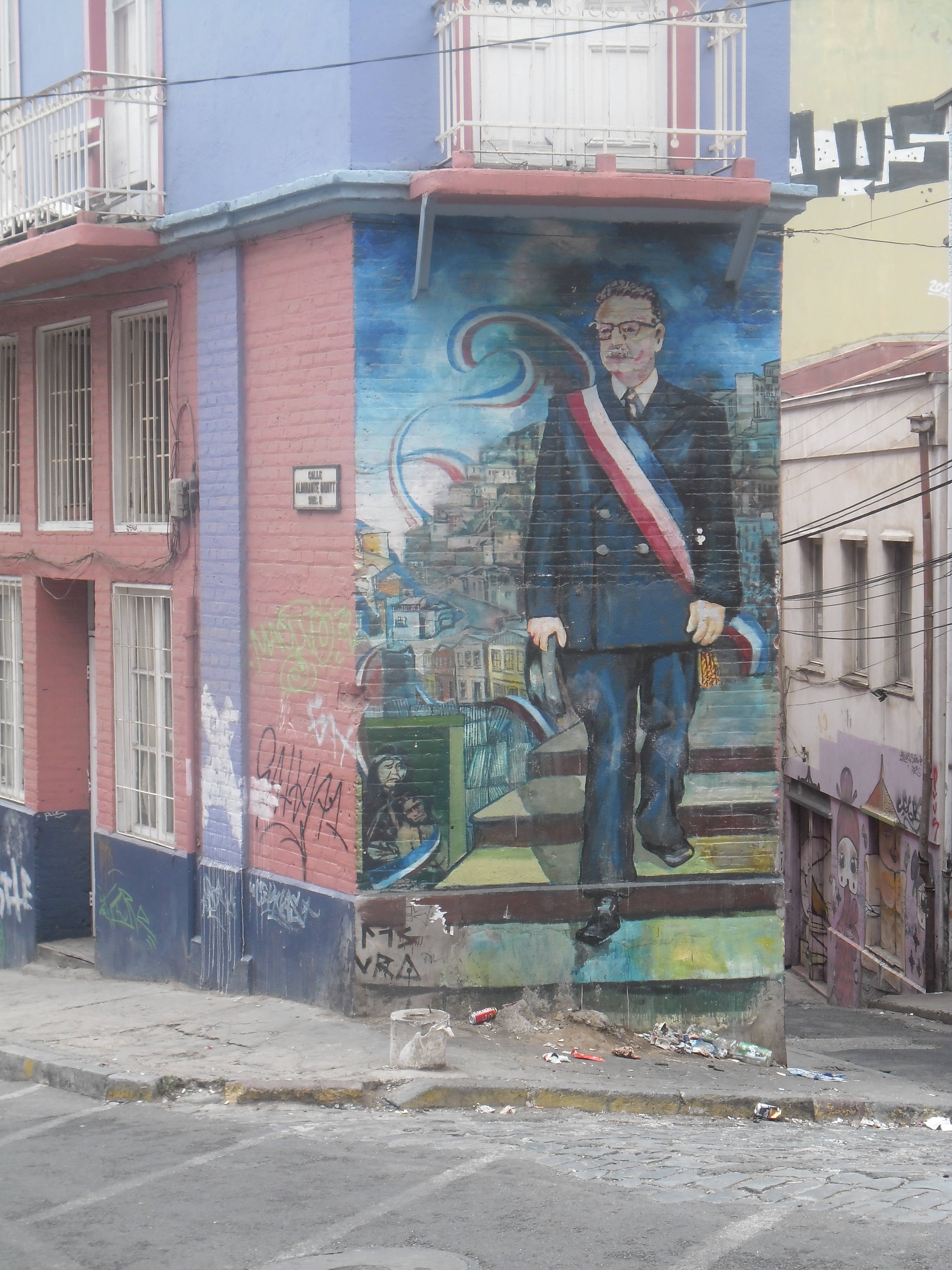 She finally got her chance after her retreat. We went straight there from Santiago. Valparaíso is a port city, about 100 kilometers from Santiago. The guidebook says that “it is the most unique city in Chile, and perhaps in all of Latin America.” This is because of a combination of natural geography and human ingenuity. The city is designated as a UNESCO World Heritage Site, for its architecture, geography, and history. The city is on a bay (hence the port) and it rises dramatically out of the ocean. It is immediately steep and hilly; Valpo is comprised of 42 separate hills, some of them very steep and high. These hills (cerros) offer magnificent views of the beautiful bay. Also, humans have built beautiful buildings up and down all of these hills, and have built boxcar elevators (ascensores) that will c arry you up and down the hills, for a small price. The earliest of the ascensores were built in 1886, and the most recent one in 1920. There used to be 39 of them, but now there are only ten that are still operating. They’re old and rickety, but they still work, and they definitely save your knees. SAM_0543SAM_0514There are great views of the city on the top of the cerros.SAM_0515Valparaíso is a working port. The navy has ships there, and big freighters come and go, loading and unloading. Cruise ships too. The port is always loaded with tourists watching the action. You can also get on little tour boats to take a tour of the bay. SAM_0513SAM_0511SAM_0510SAM_0512The town is full of tourists. Lots of peole from Brazil and other parts of Chile. Lots of people from France and Germany. Mostly, they wander through the streets, looking at the beautiful views and discussing which restaurant they want to eat at. The big vistas out to the bay, the steep streets, the colorfully painted buildings. The town is also famous for the colorful murals that are all over. SAM_0554SAM_0522SAM_0519SAM_0516Even Salvador Allende has a rememberance.