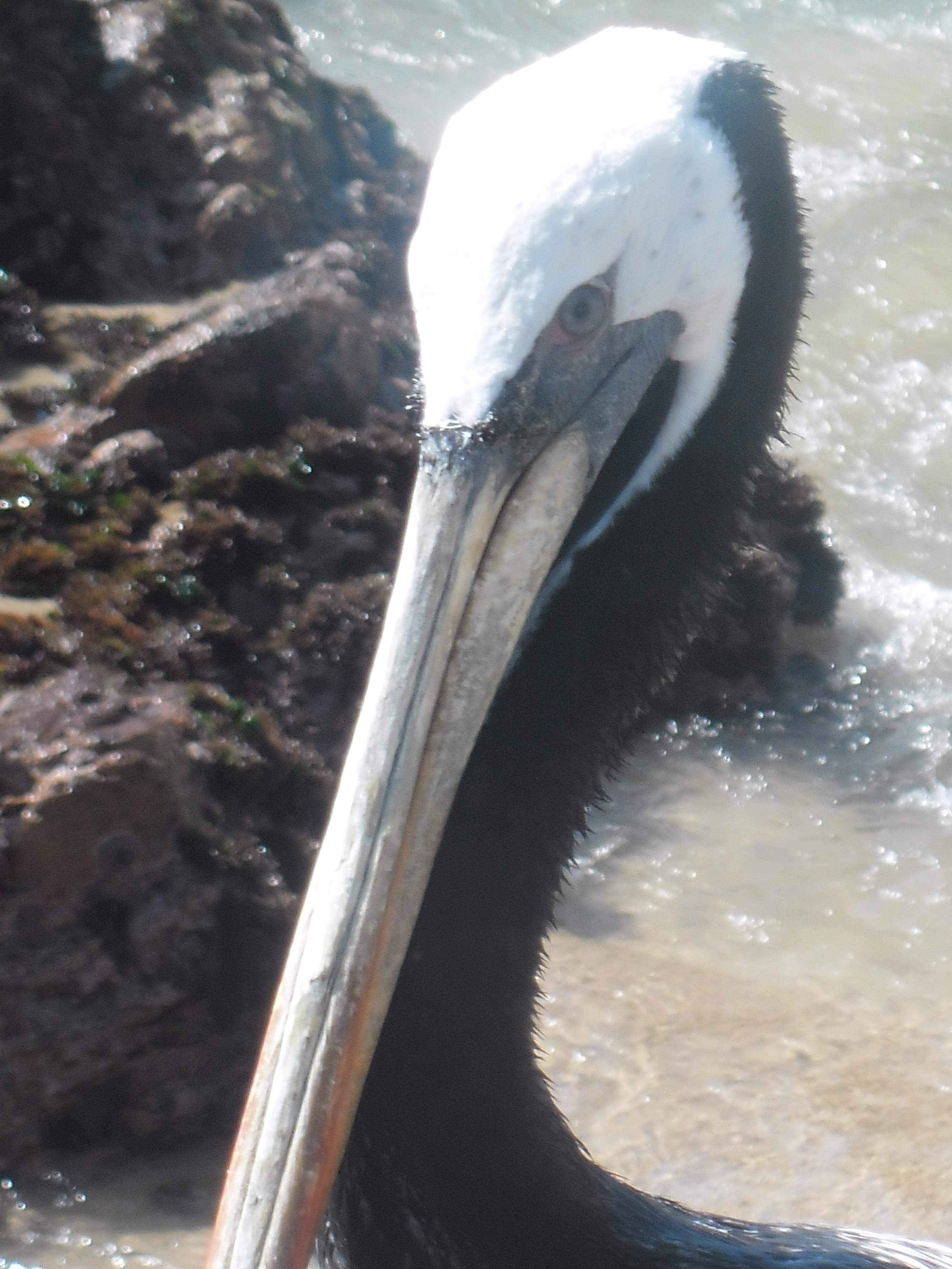 SAM_0542There were also lots of pelicans nearby. We spent an hour or so being closer to pelicans than we’ve ever been. They are spectacular birds, and I love seeing them on the Oregon coast, but yu can’t see them this close. And the pelicns here are different. They fly the same, but they have distinctive black and white band on the tops of their wings, visible as they fly.