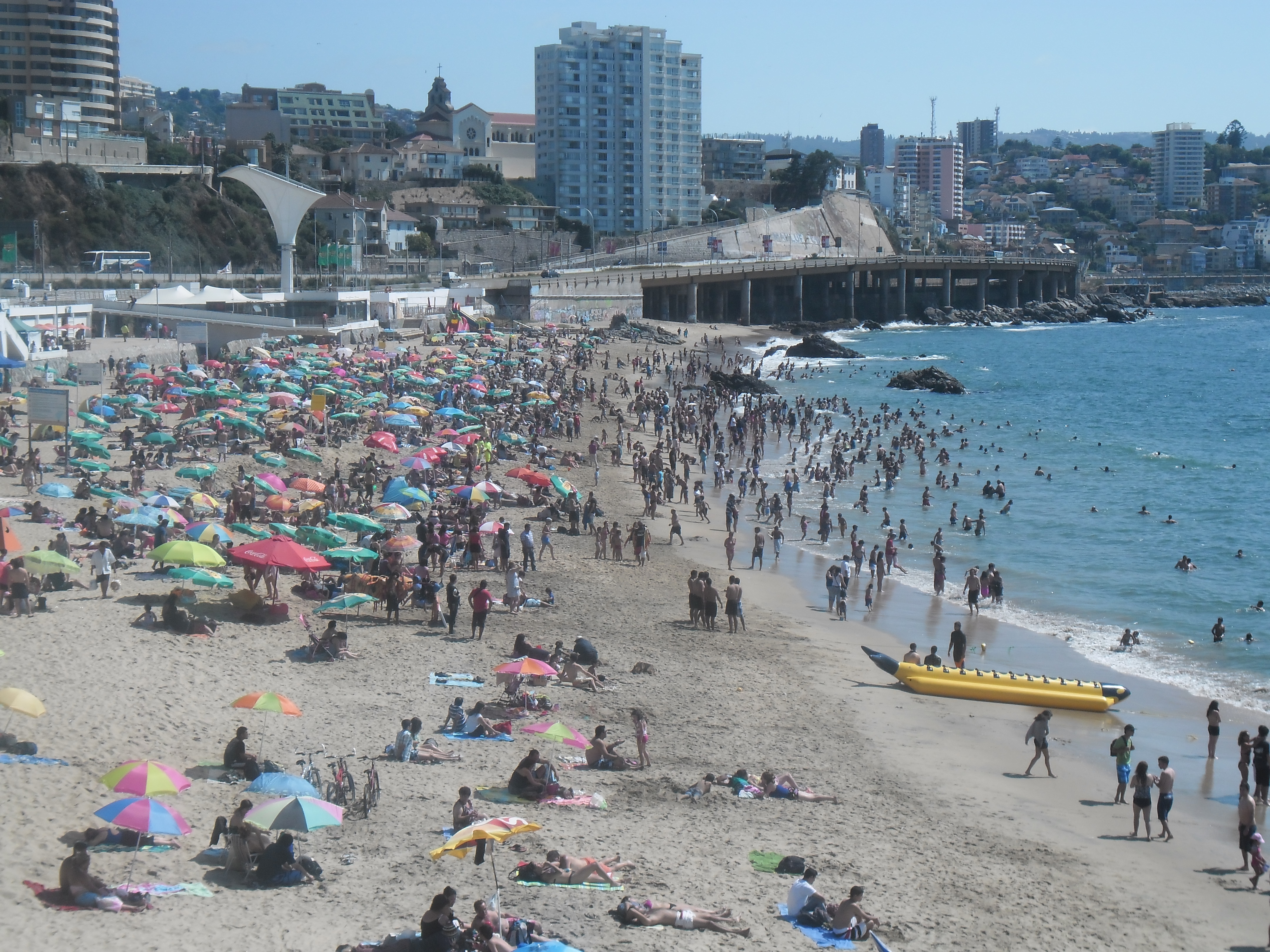 We wandered through the town like the rest of the tourists, enjoying the beauty. SAM_0551SAM_0550SAM_0556One day, we took a bus and went north of town, to check out the beaches and towns. This is mid-January, and high season for the people of Santiago (los santiaguinos) to head for the beaches. It’s summer vacation for the kids, it’s hot in the city, and families take off. Viña del Mar is a city right on the ocean, just a few kilometers from Valparaíso. The beaches were full of people. Chilenos everywhere you looked.