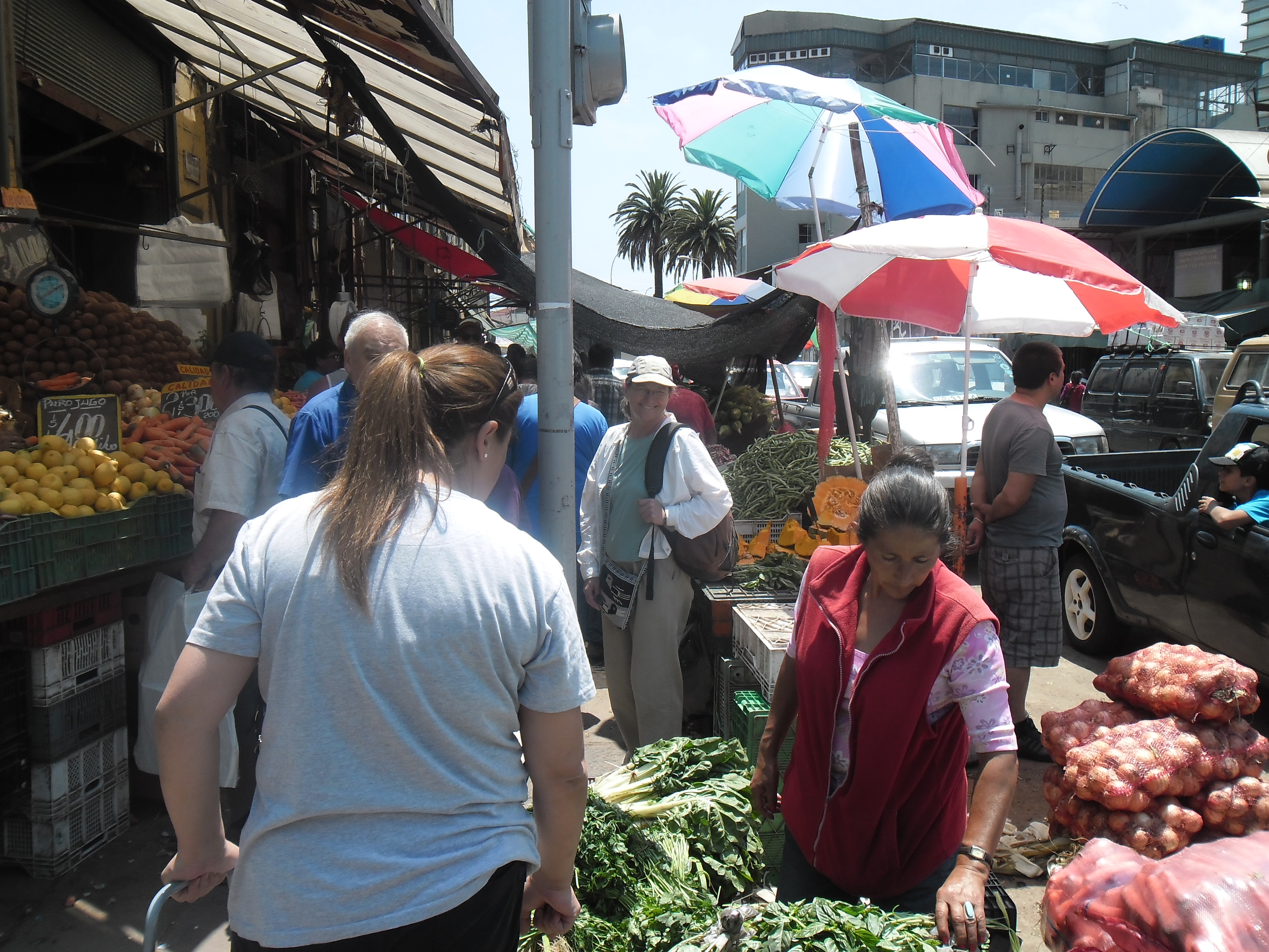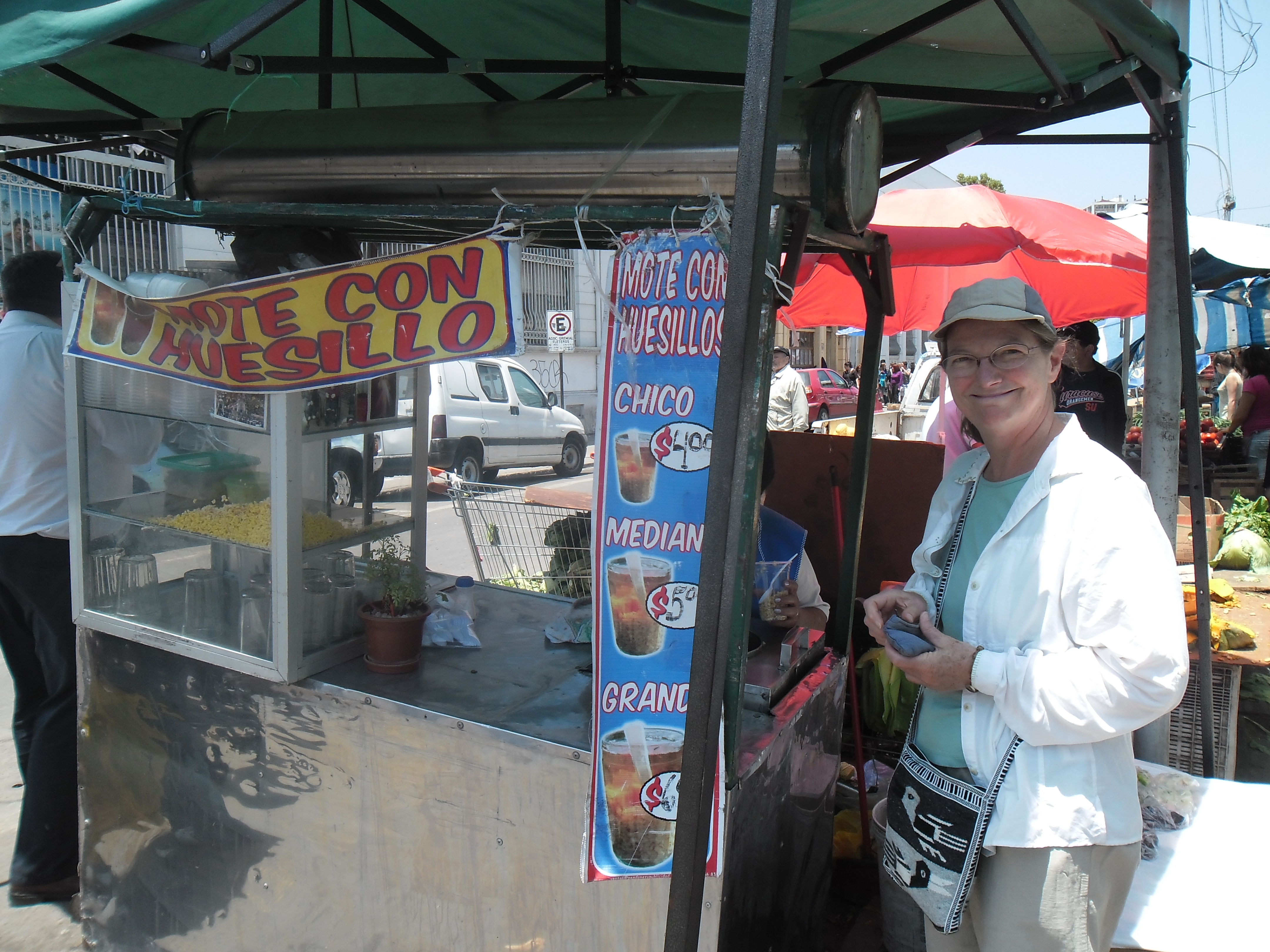 SAM_0580Mote con huesillo was one of our favorite drinks in Chile. Mote is a type of grain, a type of wheat. Huesillos are little dried peaches. They boil the mote with the huesillos (it actually means little bones, or pits) and some sugar, and they serve it cold. We saw it all over Chile, always on the street or in the markets. This was our last mote con huesillo, because in the evening we got on a bus to Mendoza, Argentina. A month ago, we were in the cold rain of Chiloé. Now, on January 16, we´re headed toward Mendoza, the city of wine, mountains, and sun. Chile has treated us well. SAM_0583
