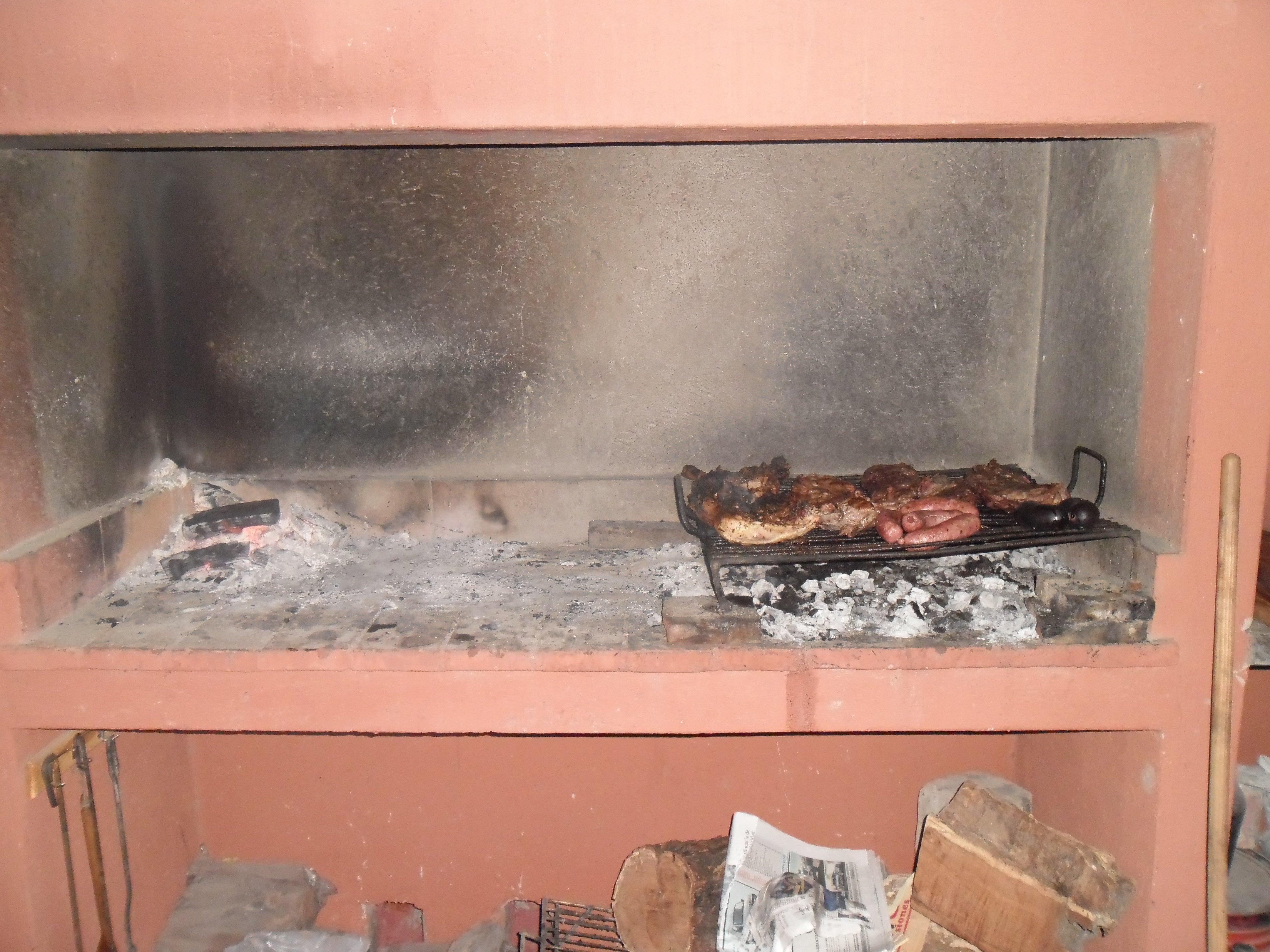 One of the features of an Argentine parrilla (that’s the structure that is in every backyard in the entire country, where they cook the meat) is its size, and one of the tricks of the asado is to have a fire burning in one corner to produce coals and embers, while the meat cooks on the other side, slowly and evenly. The coals and embers are continually transferred, from the fire in the corner, to under the meat. SAM_0594Raúl was very good at maintaining the proper temperature. I got the feeling that he had done this before. SAM_0591SAM_0593The next day, we said good-bye and caught a bus into town. Here’s Moni with all of our belongings, waiting for the bus. In a few more days, we will be off to Salta, way up in the northwest of the country.SAM_0595Onward Ho!