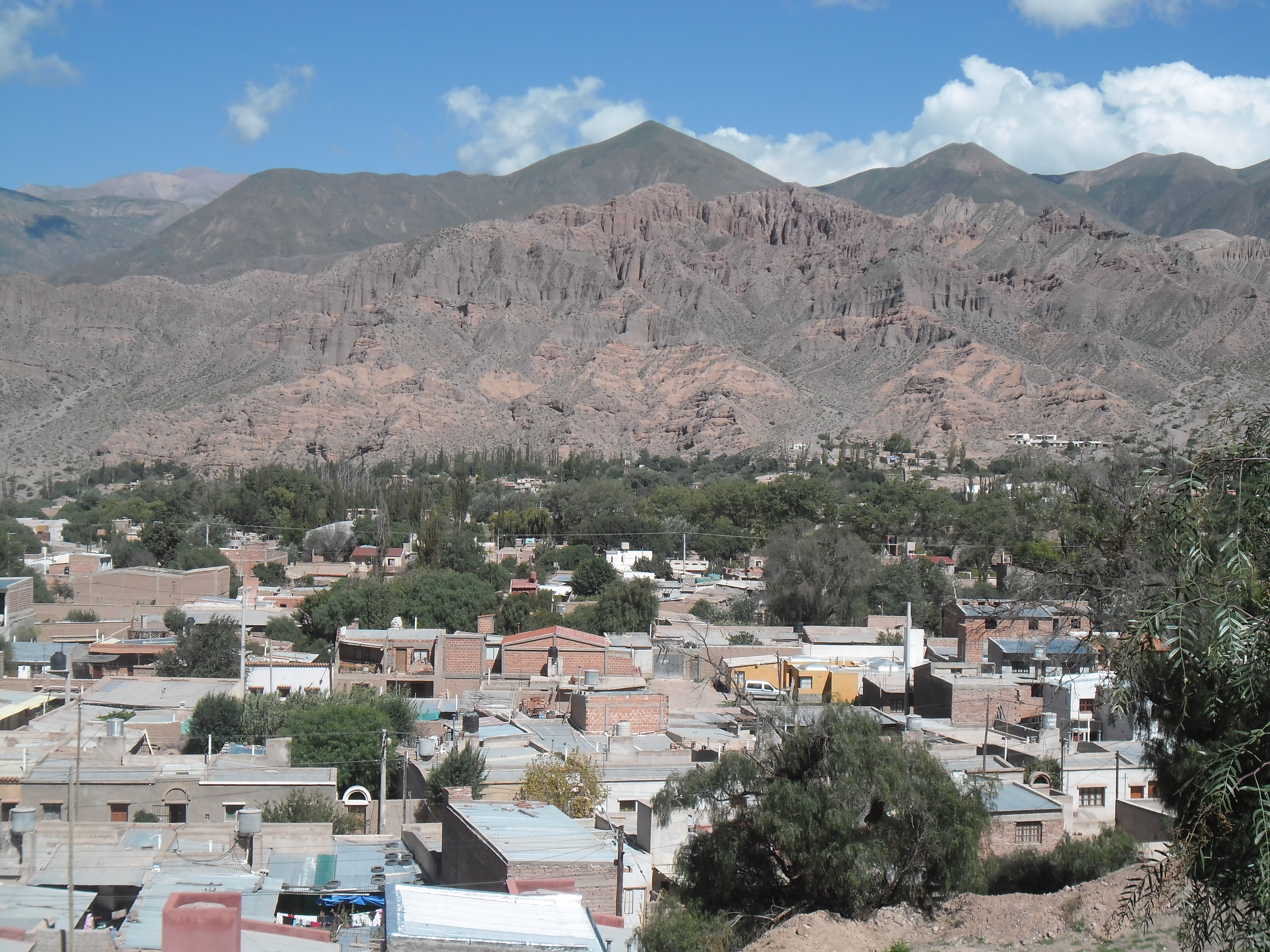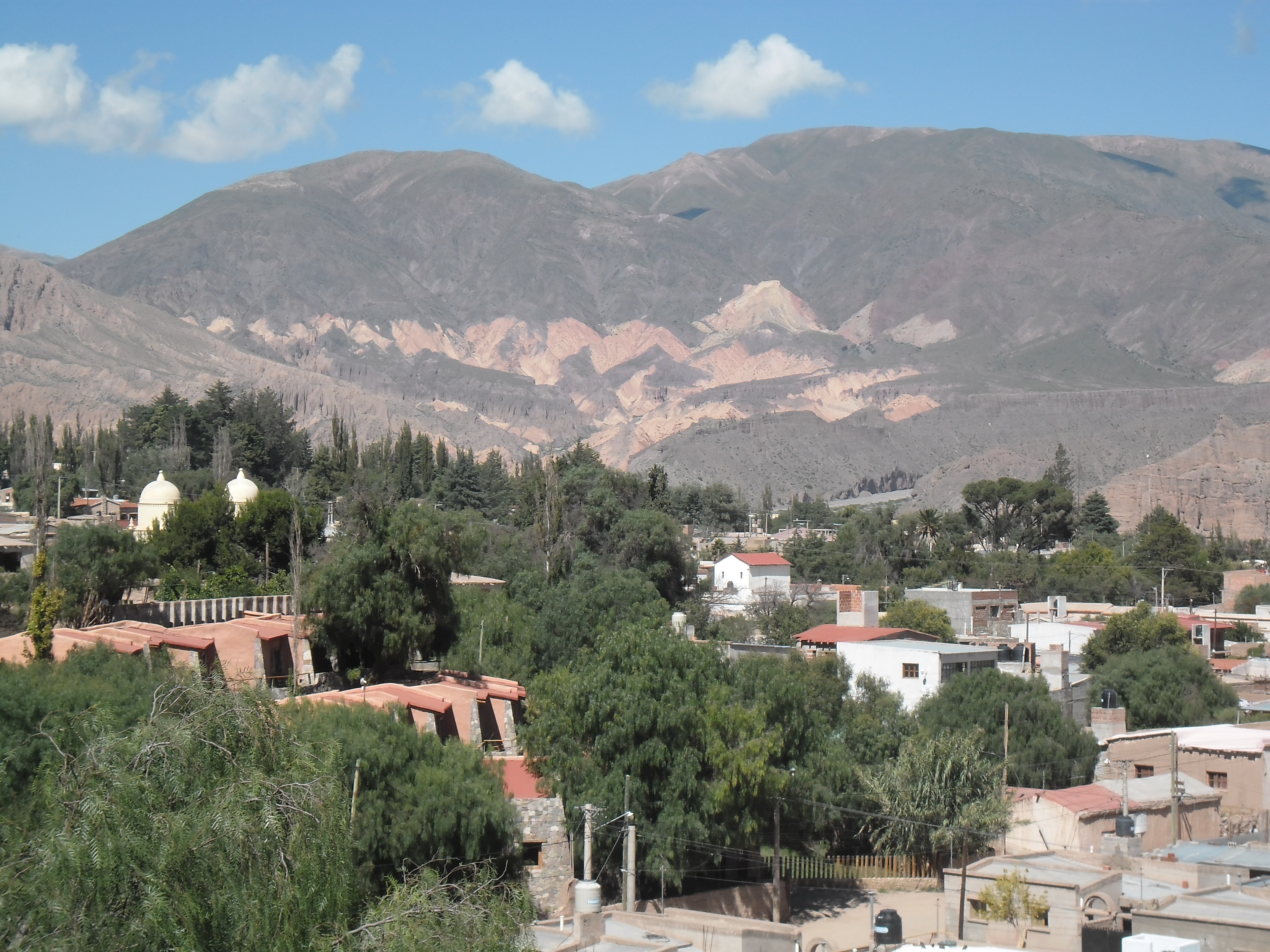 The road follows the river at the bottom of the canyon, and the mountains rise up on each side. There are three main villages that are nestled in the Quebrada, north of Jujuy city. Purmamarca is the first. It´s a teensy little village that is at the base of La montaña de siete colores. Layers, strata, of different colored rock shine in the morning and evening light. Tour buses come just so people can gaze at the colors. The next two villages, Tilcara and Humahuaca, are also at the base of impressive mountains.