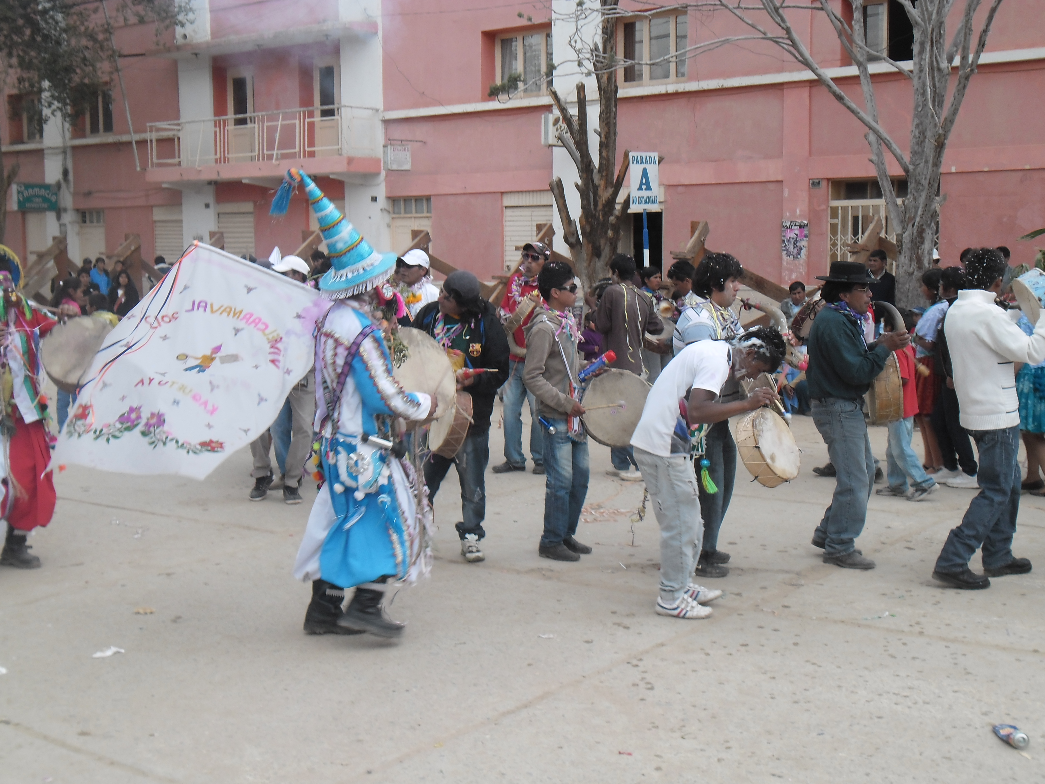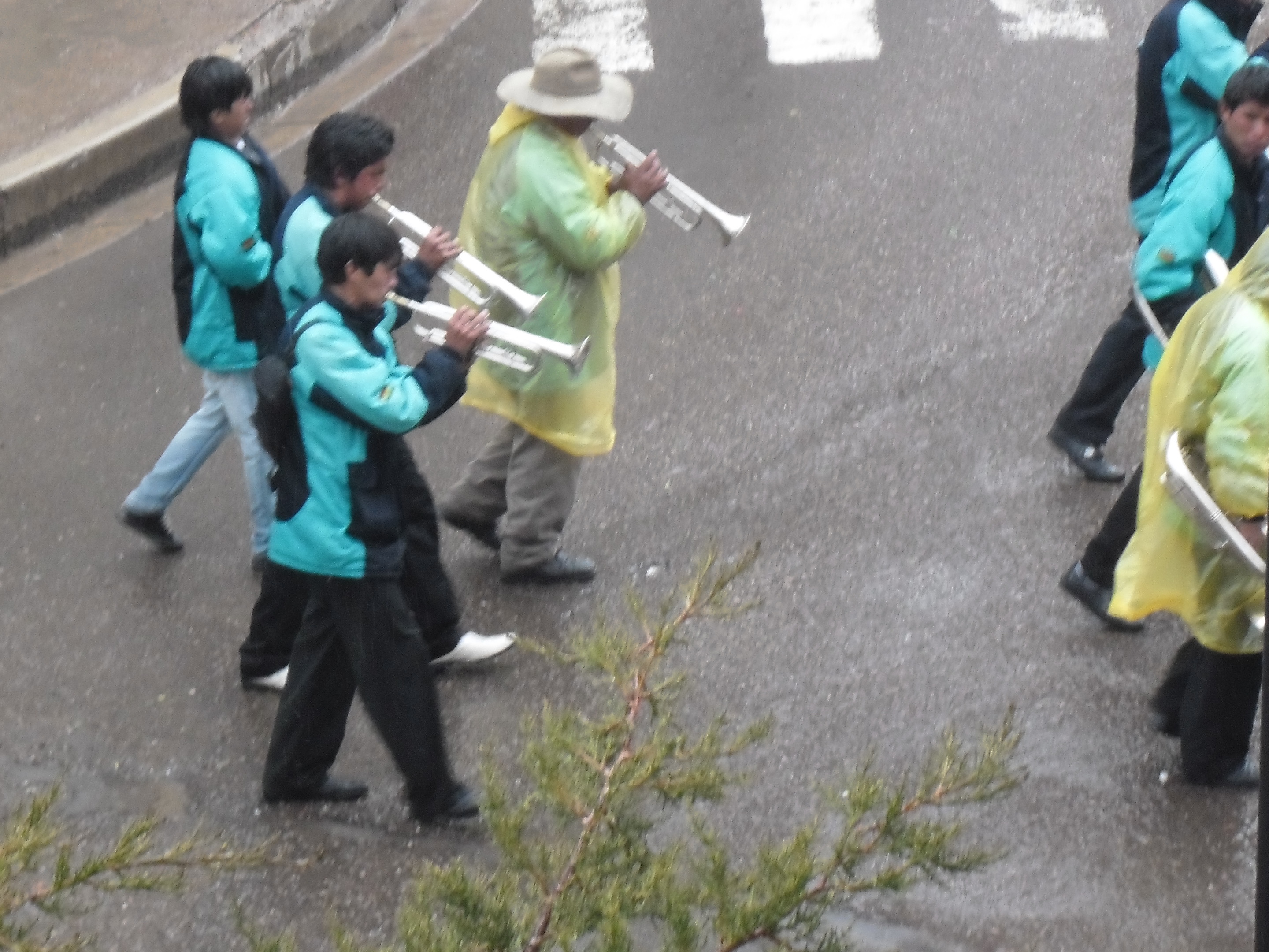 SAM_0764Boys – little to big – ran around the square in groups with plastic toy weapons that squirted water. The targets were the girls, some of whom ran squealing with delight while others hovered close to parents and were generally off limits. There was collateral soaking we discovered to our distaste. We were also to discover that water fights were a national custom during Carnaval. Potosí held more of the same, with the additional weapons of water balloons and cans of spray foam. We were seriously foamed in a drive-by shooting on the narrow streets of Potosí. Many citizens wore thin plastic raincoats for protection – even band members were not immune.