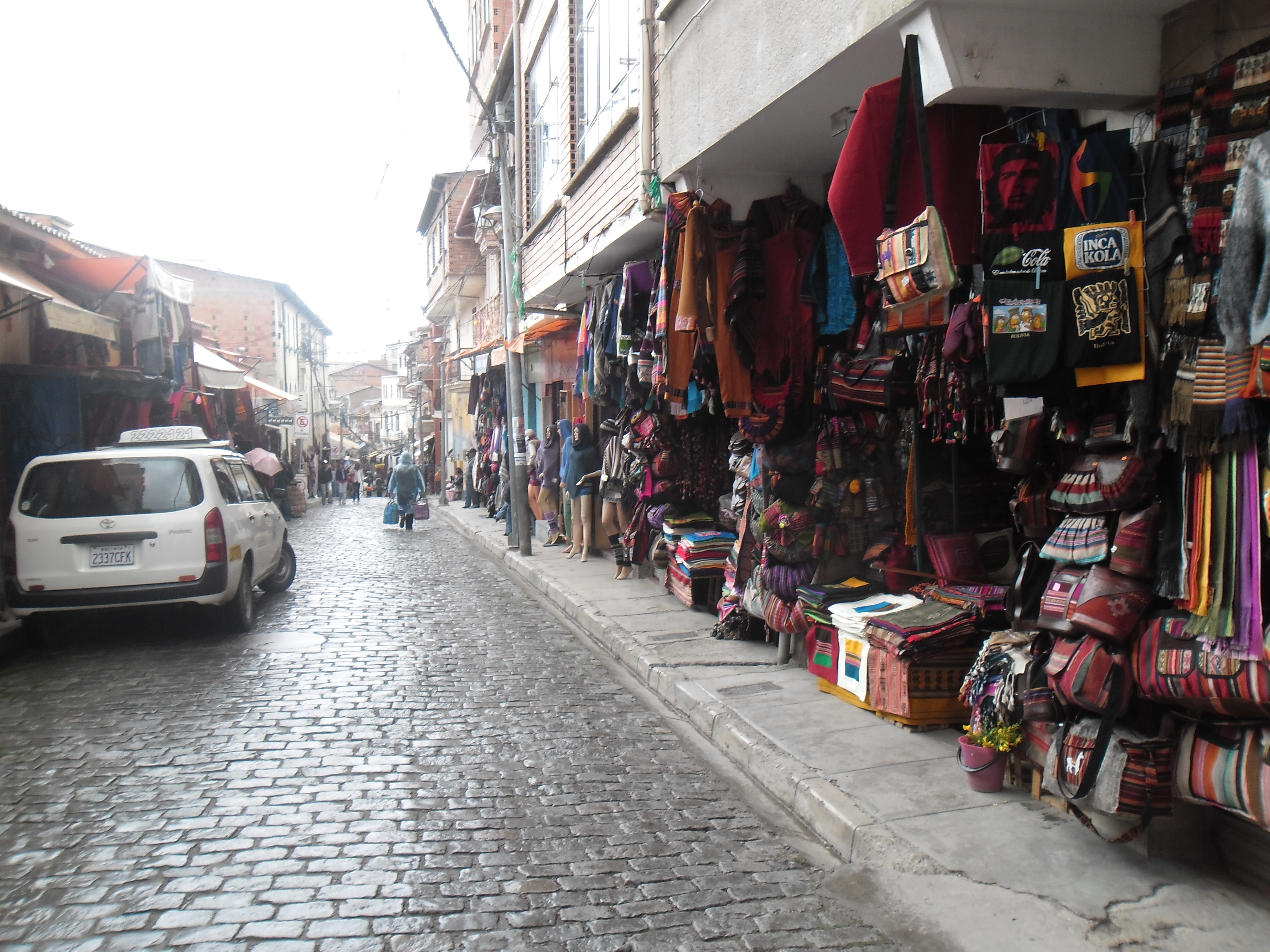 SAM_0800We stayed in La Paz for only three days, but we loved the pulse and spirit of the city. We met María and Agustín at their little business. María sells fabric, sweaters, and indigenous flags. Agustín is a musician who produces pipes and flutes, and who plays the charango. The charango is a traditional Bolivian stringed instrument, smaller than a ukulele, but with ten strings.