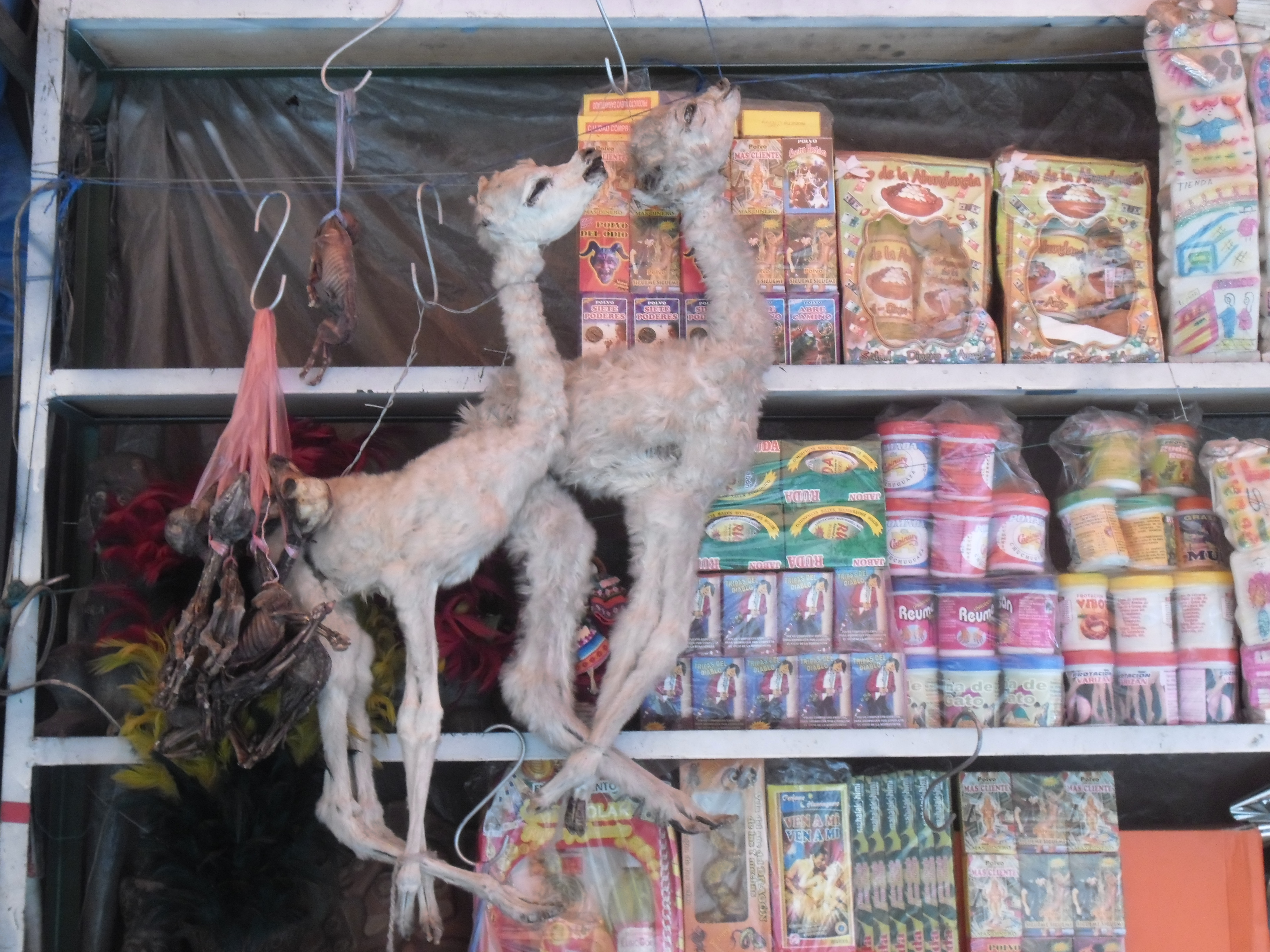SAM_0799SAM_0802The markets and the stalls sell everything, from beautiful 100% alpaca ponchos and sweaters to llama fetuses. These are used for an offering to Pachamama–sacred mother earth. The fetuses are often buried at the entrance of a new home or business in order to bring prosperity..