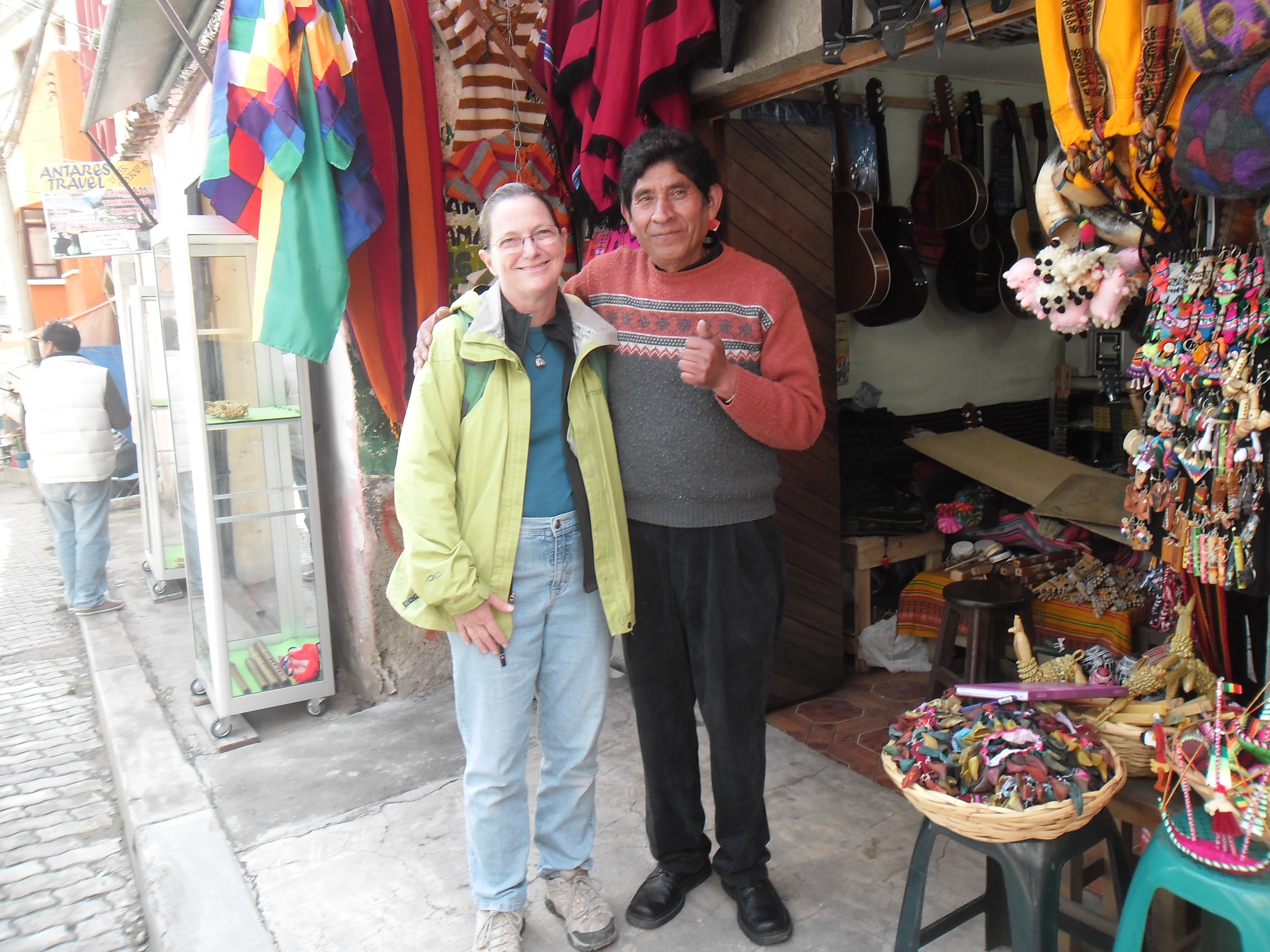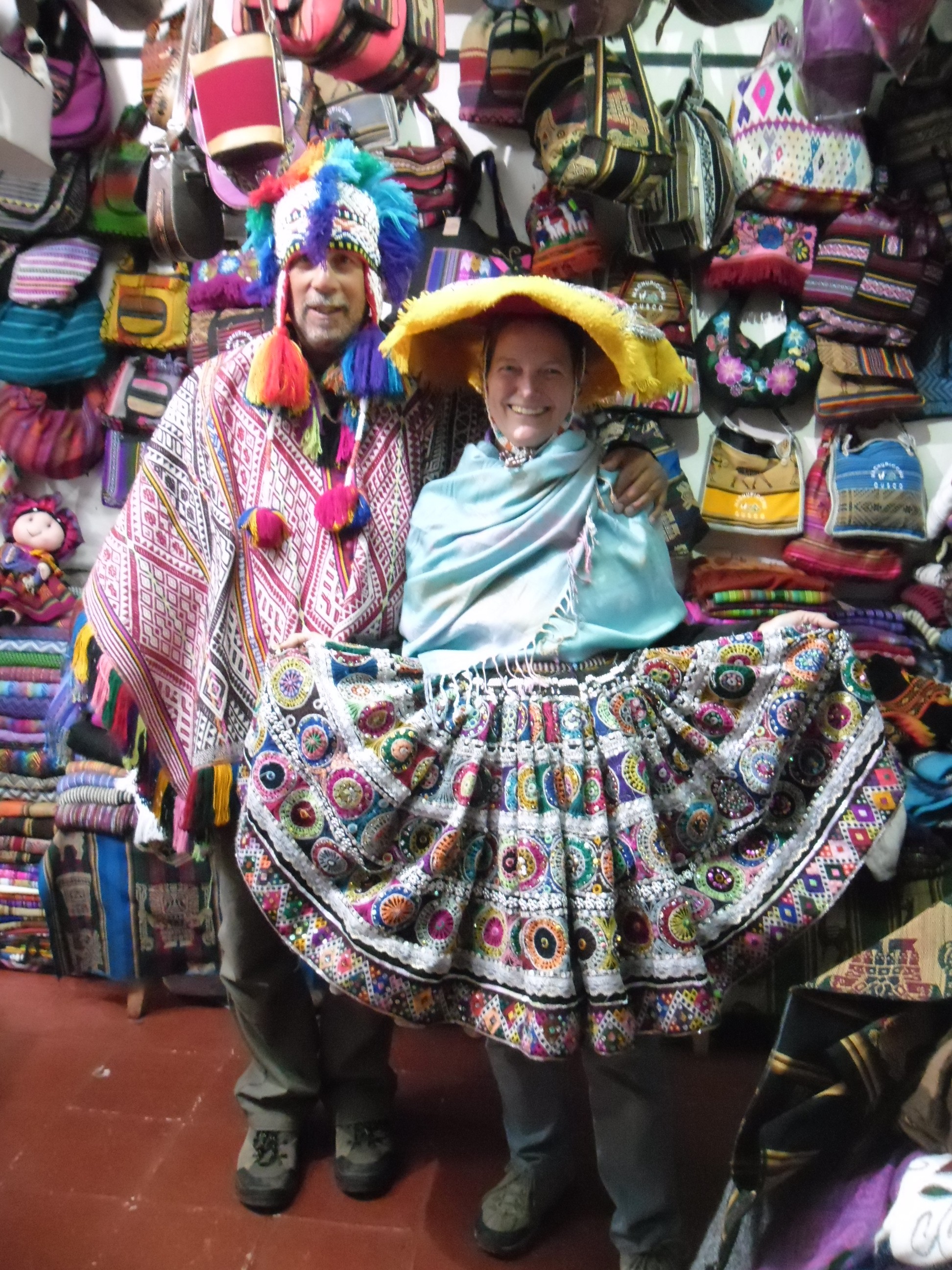 One day, a chica named Jovana pulled us into her little shop and giggled as she dressed us up in traditional clothing. She had a great time doing it, all because Monica wanted to buy a stuffed guinea pig (called cuy) that was in front of her store. Cuy is kind of a national dish here. Lots of restaurants serve it, oven roasted. Cusco has something for everyone. We loved getting to know the city and some of the people. The heart of the Andes. The heart of the cusqueños.