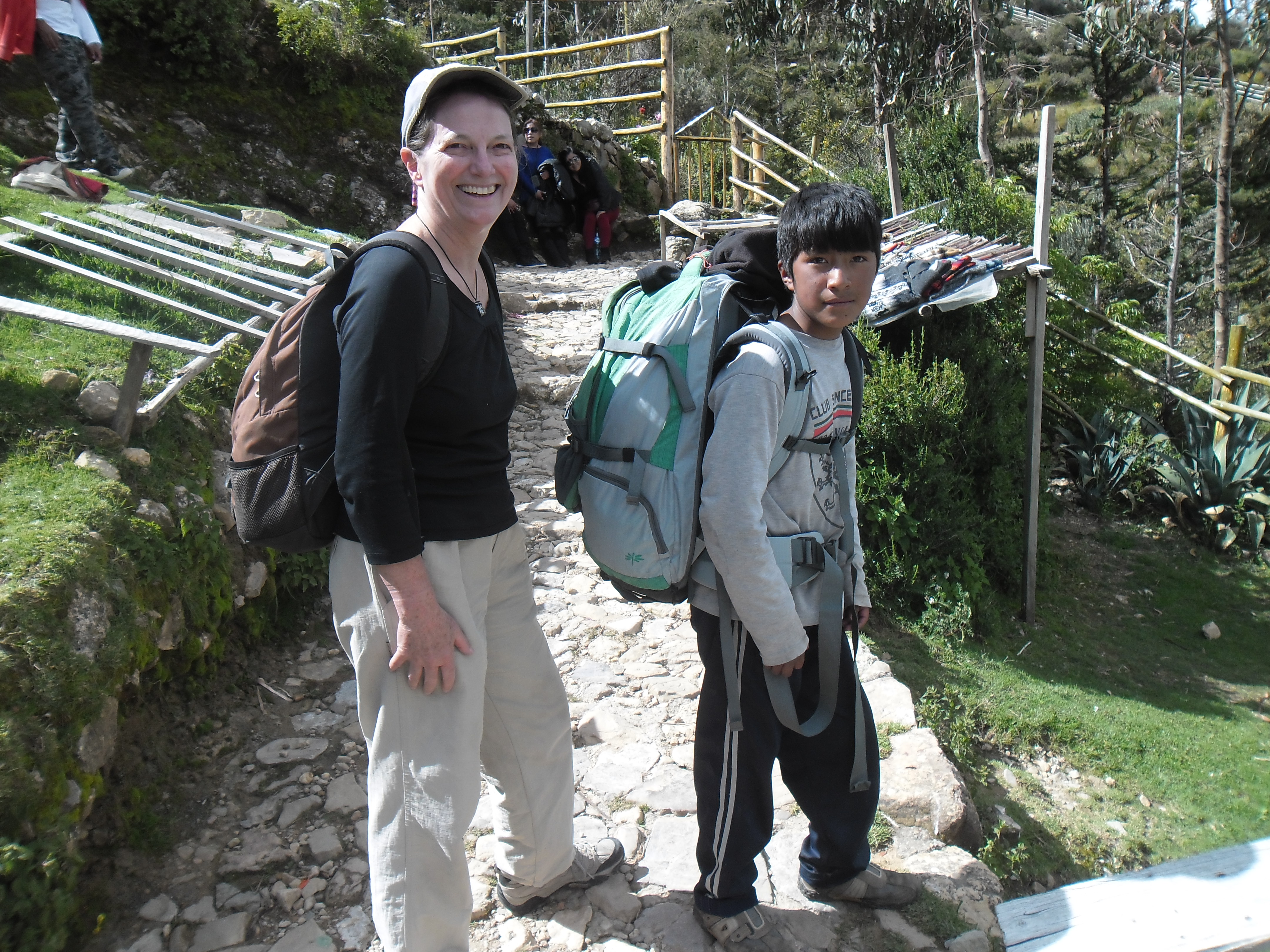 SAM_0851SAM_0934SAM_0897SAM_0920Monica and I made the trip up from the water three times, A thousand feet up. We were huffing and puffing and resting, while the local people (many of them ancient looking) just said Buenas tardes and kept going. The first time we went up was when we first landed, with full packs. There are kids who hang around the dock, waiting for people just like us. One of them, a boy about eleven years old, named Wilmer, latched onto us, and insisted on carrying Monica’s pack. Our pride wouldn’t allow him to do so, and we kept rebuffing and huffing. Finally, Wilmer couldn’t stand it anymore, and he just grabbed the pack and put it on, and led us up the hill. Our own sherpa, and sure worth it! Wilmer kept up a running commentary on the history of the island, his school, his grandmother, and he pointed out some herbs (named muña) that help with the altitude, and he told us we could rest whenever we wanted. He also offered to carry my pack at the same time, but that was going too far.