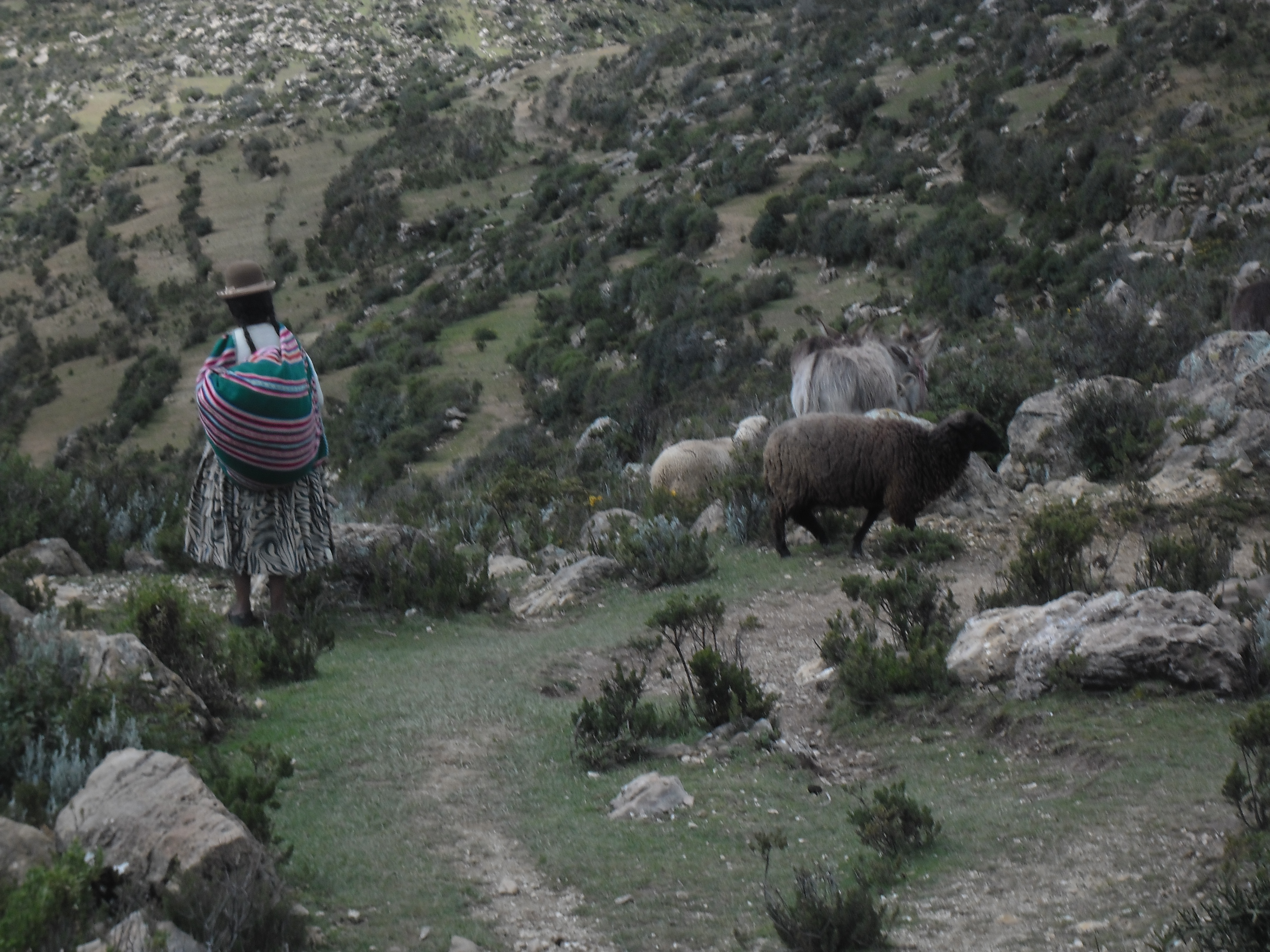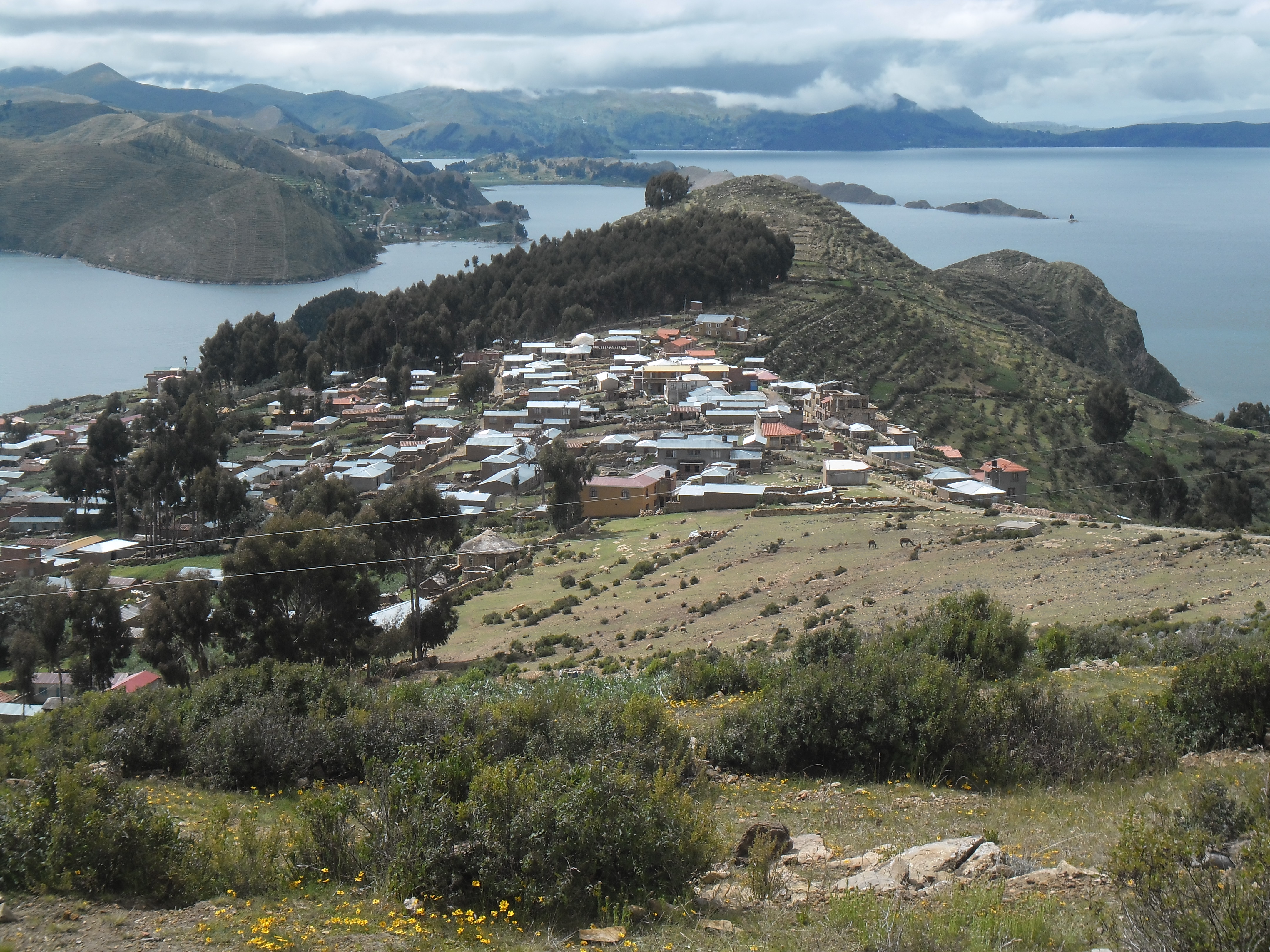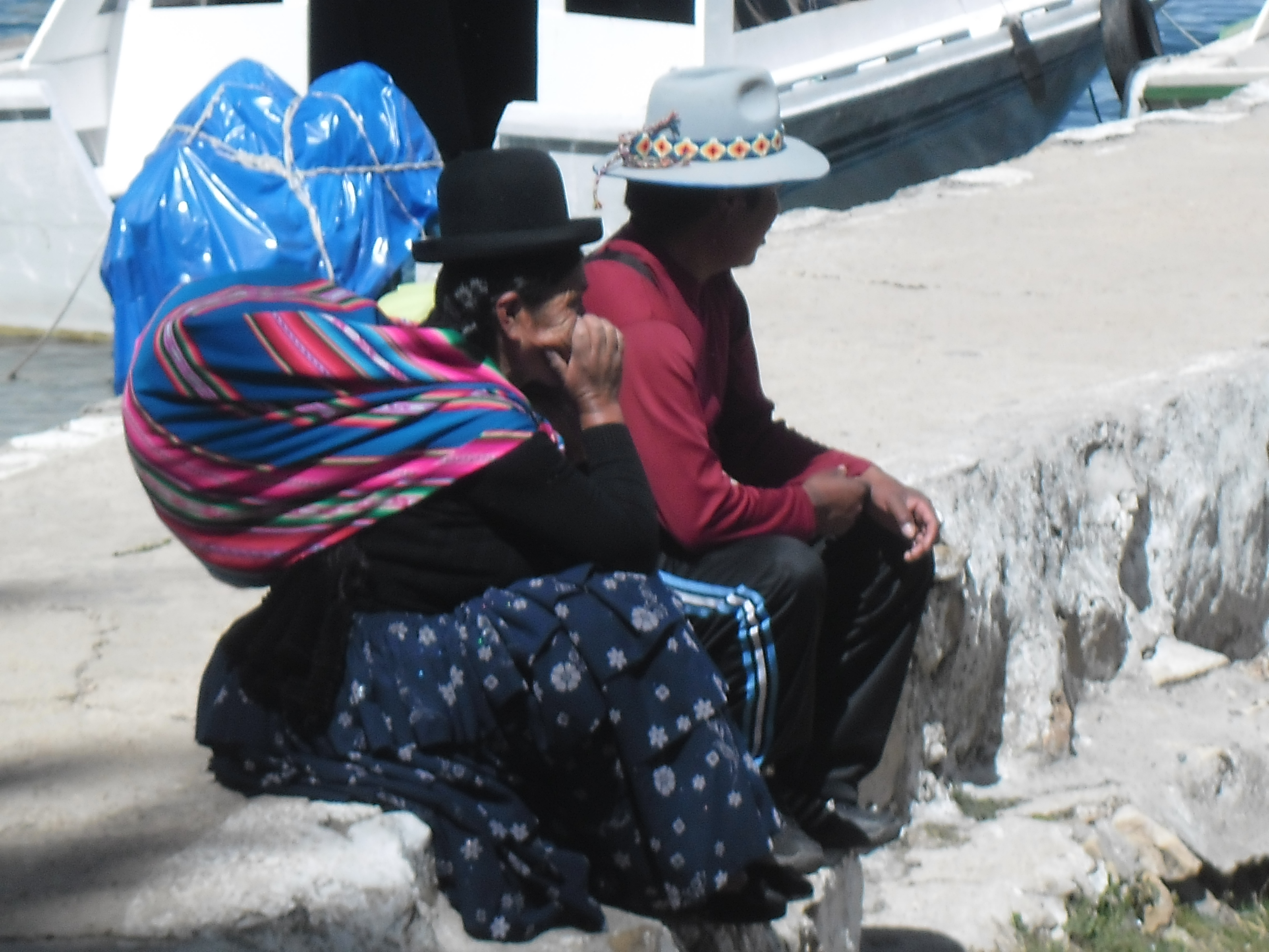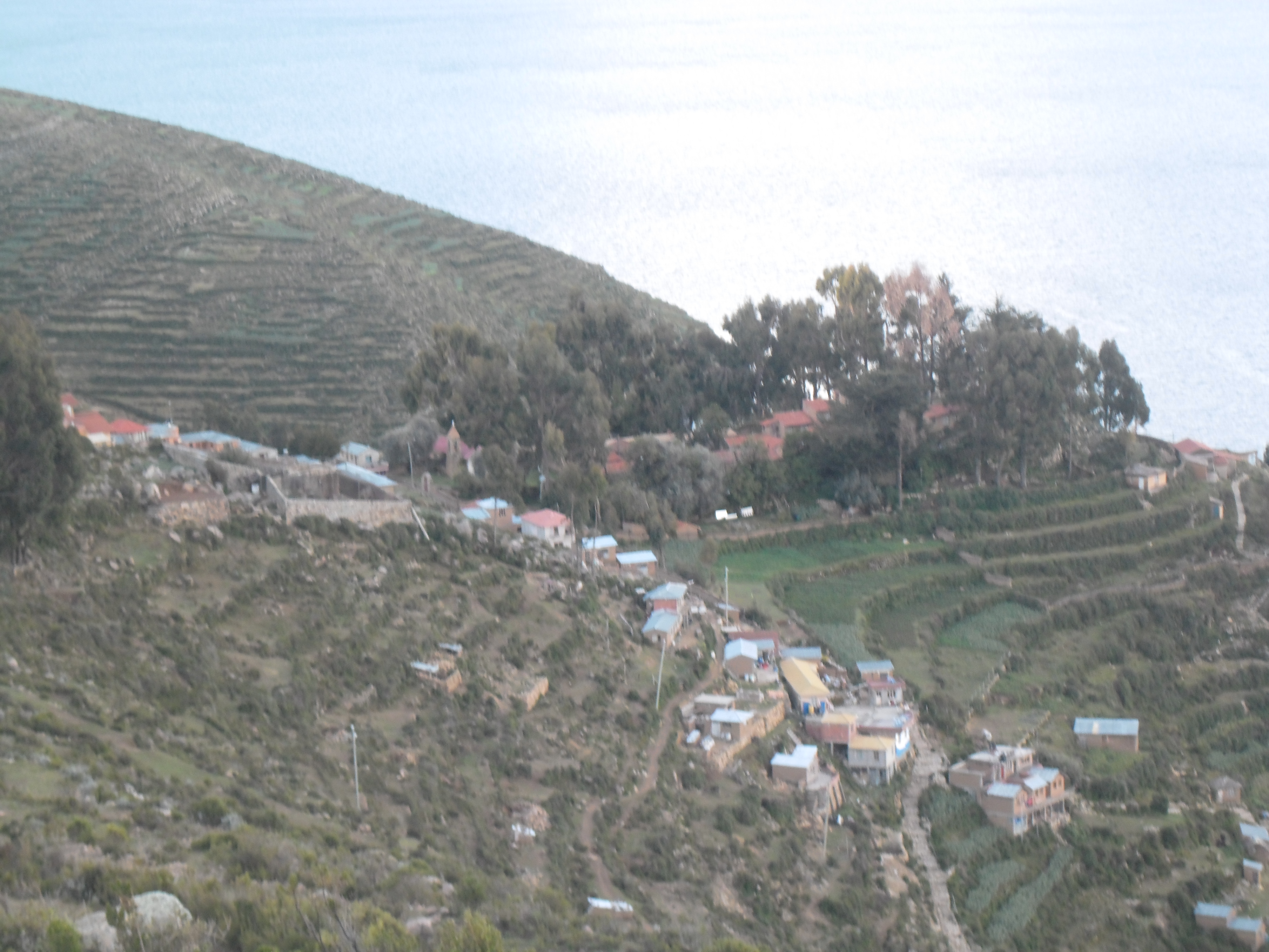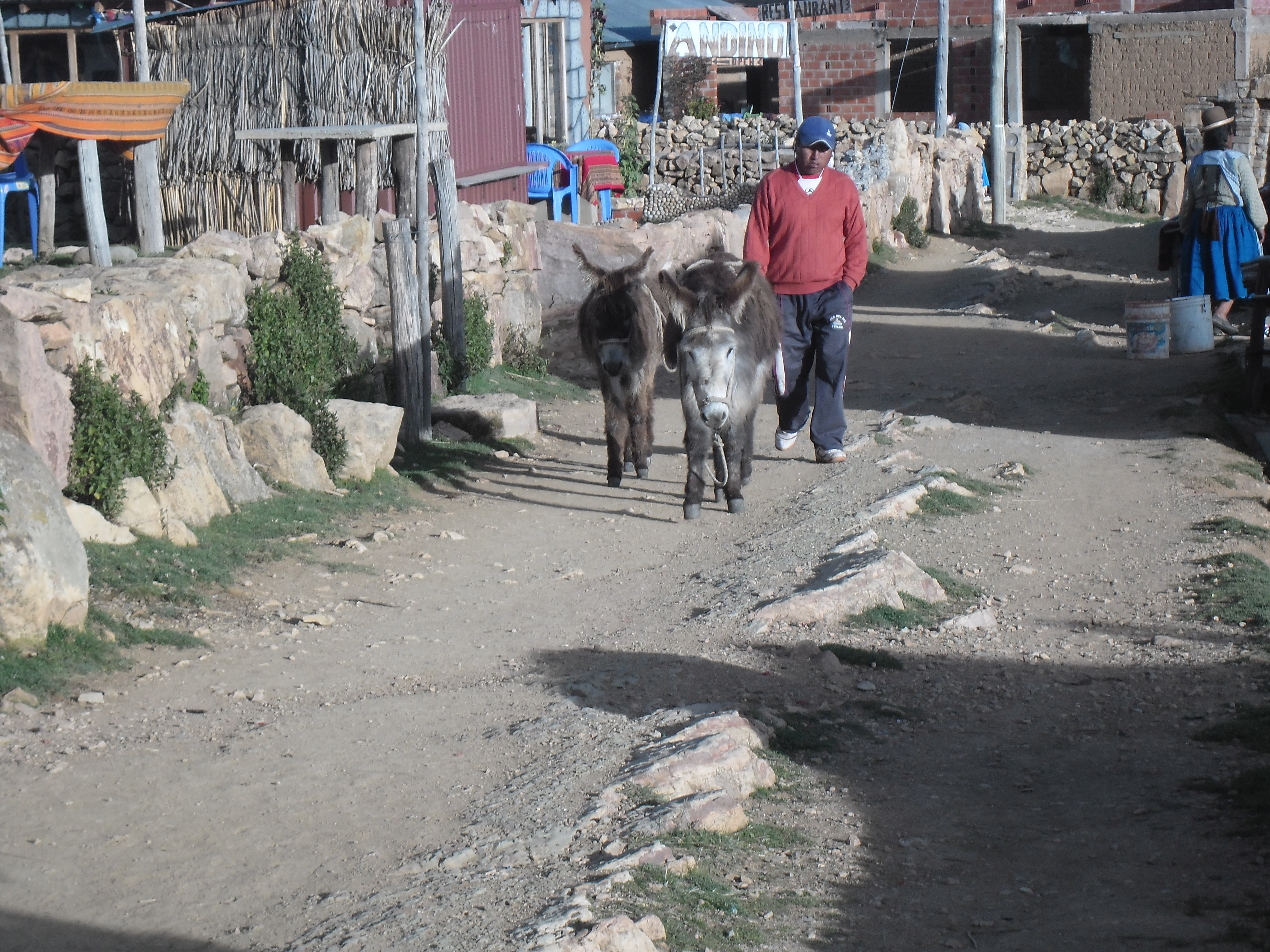 It’s an hour and a half boat ride to the island from the town of Copacabana, Bolivia. The island is pretty small. It’s about ten kilometers long, three kilometers wide. It rises steeply (to say the least) out of the water, and its ridge is 1000 feet above the lake. There are no roads on the island. There are no vehicles on the island. Neither are there (obviously) any stop signs or traffic signals. Neither are there any banks or credit cards, no internet, no telephones (except for personal cell phones) no police. Electricity arrived about ten years ago. The matter of cell phones is interesting, because often you see an ancient indigenous woman, for example, walking down the trail with her sheep like they have done for a thousand years, talking on her cell phone.
