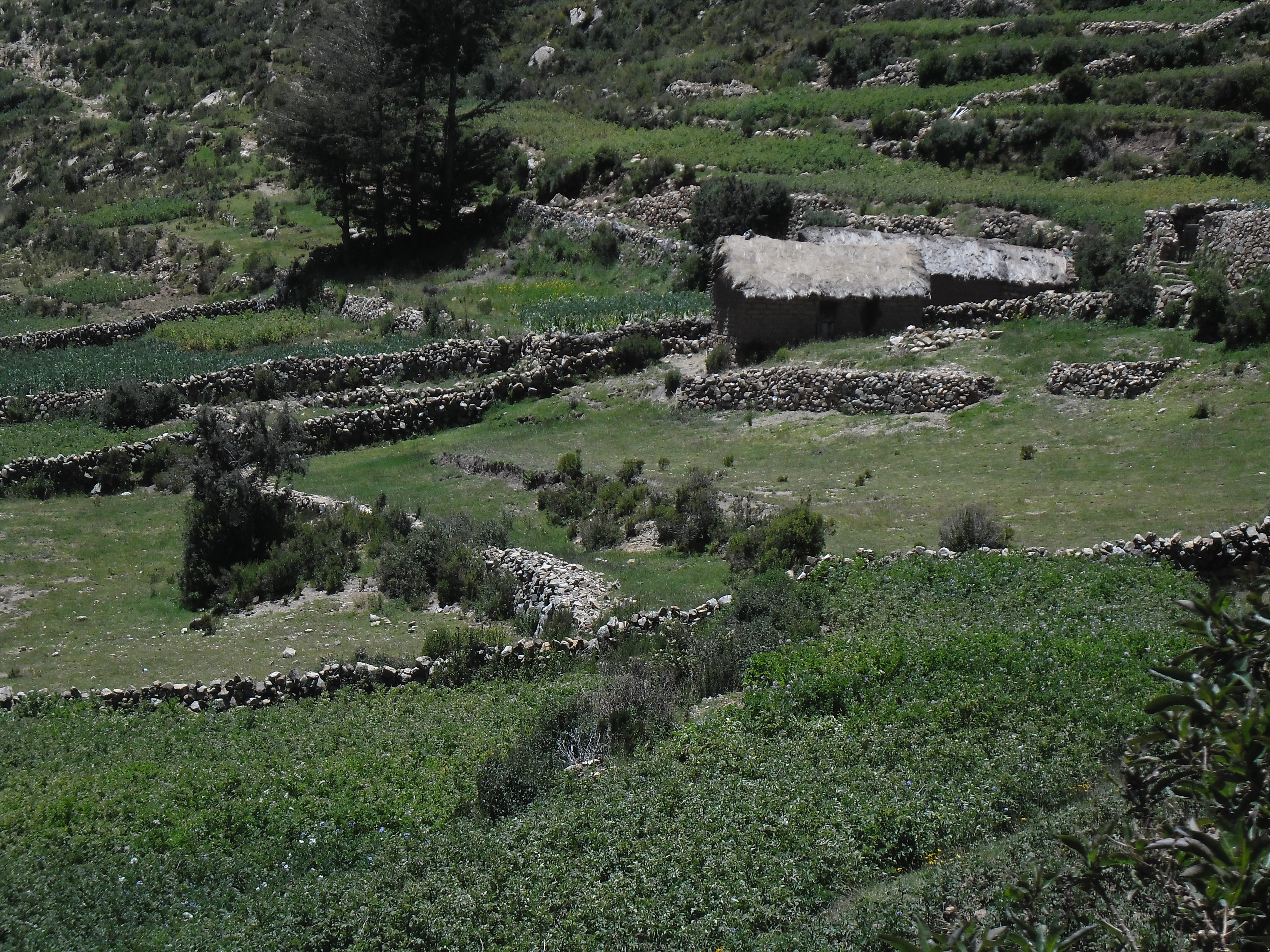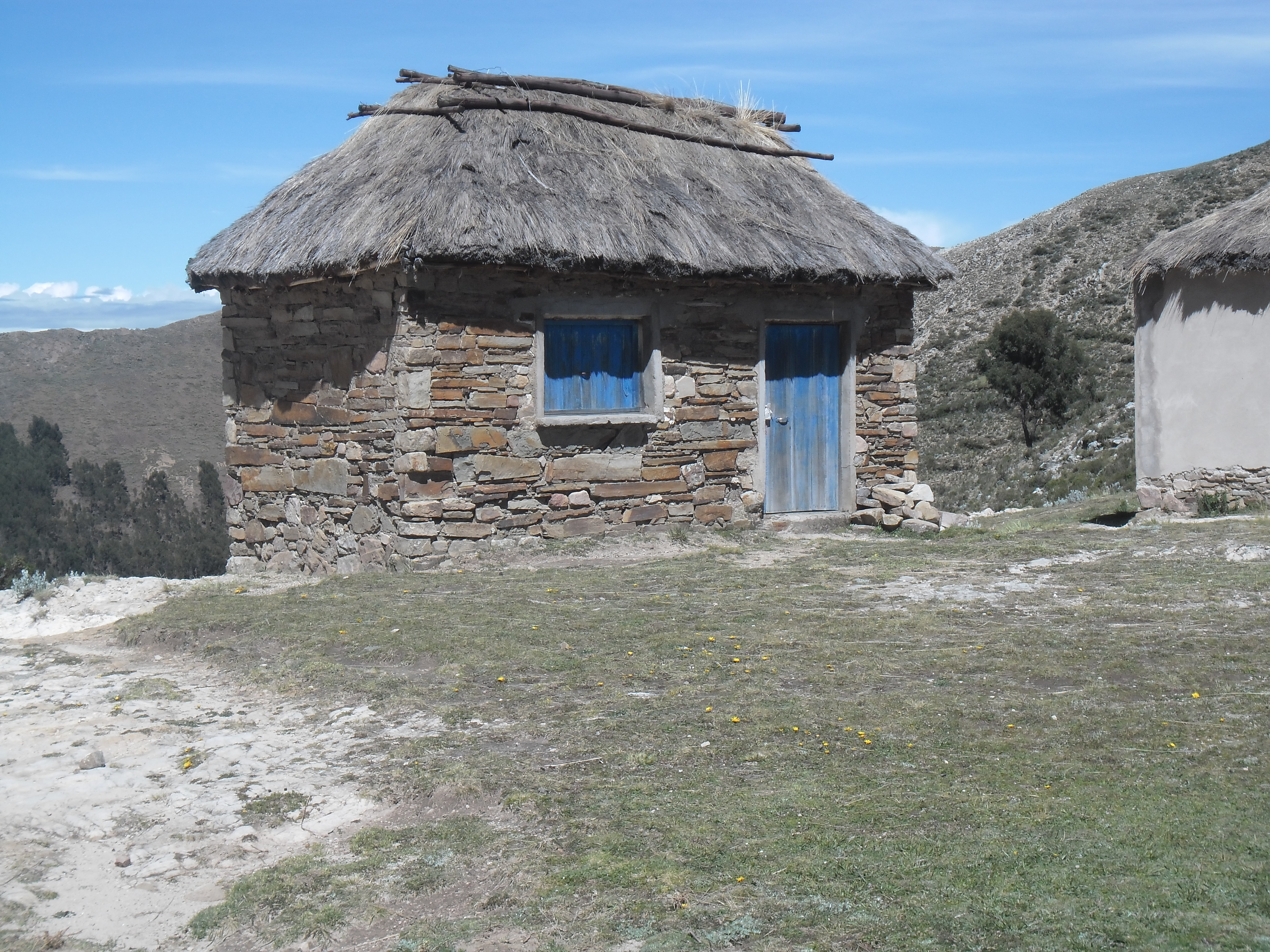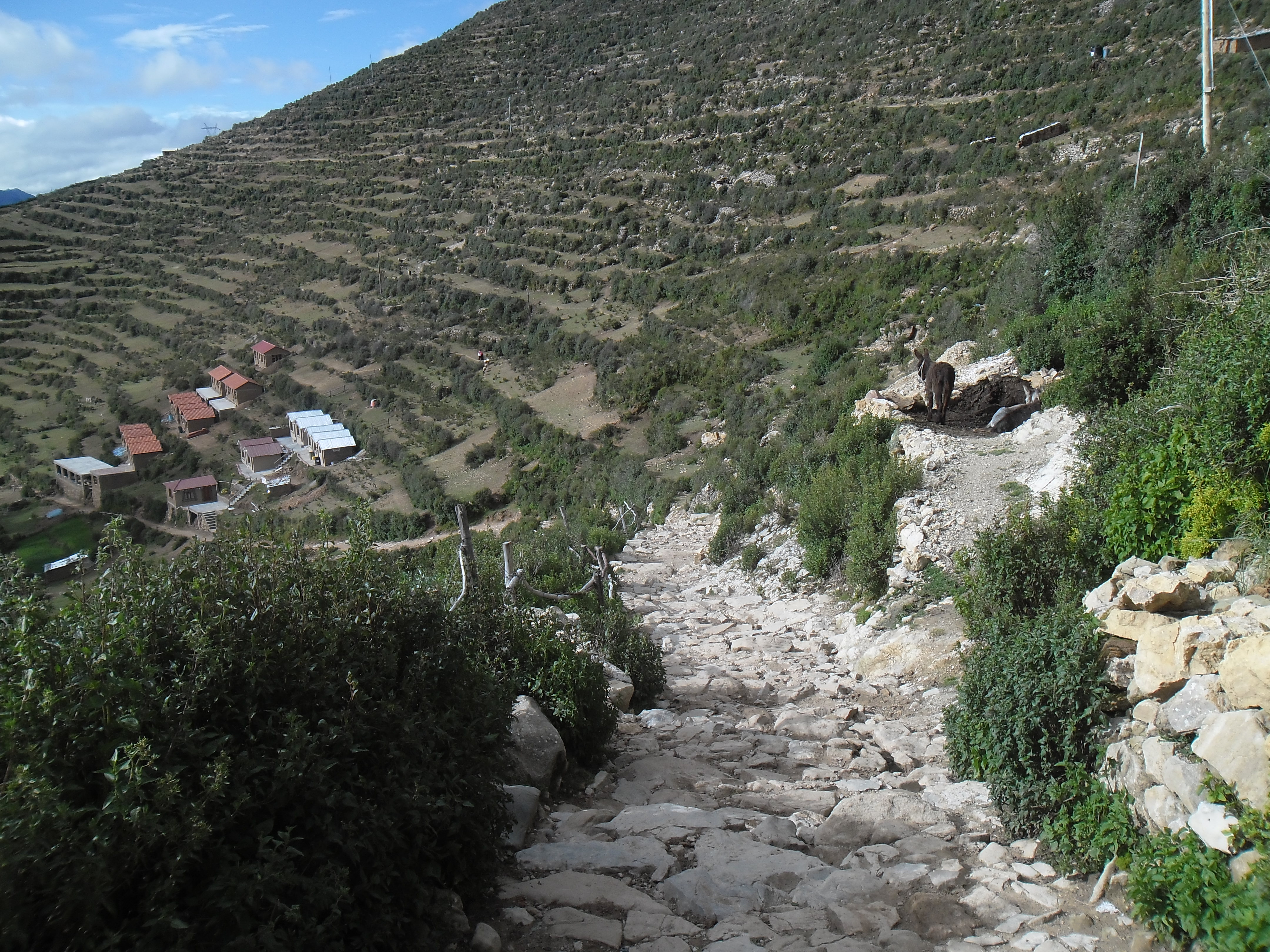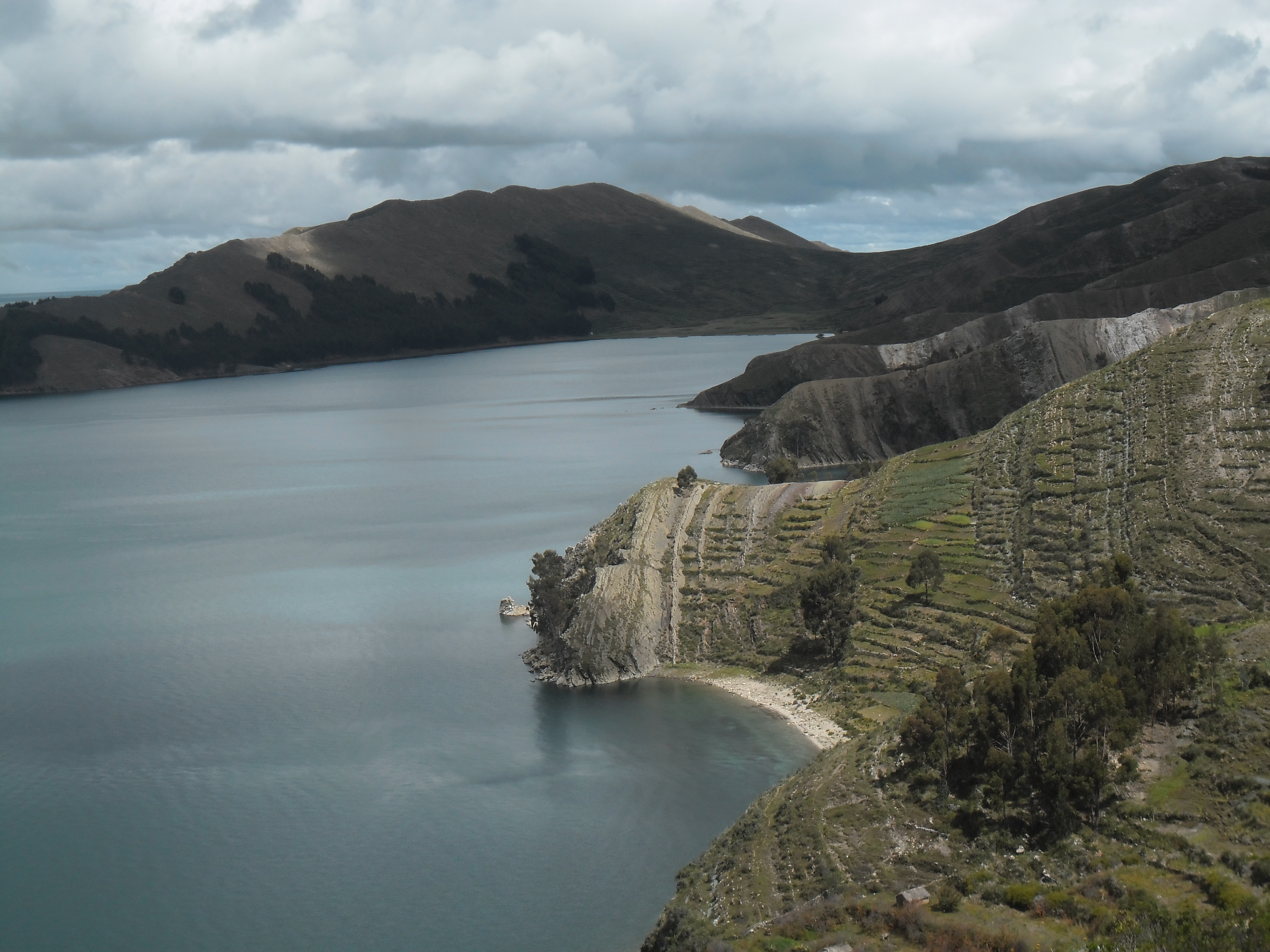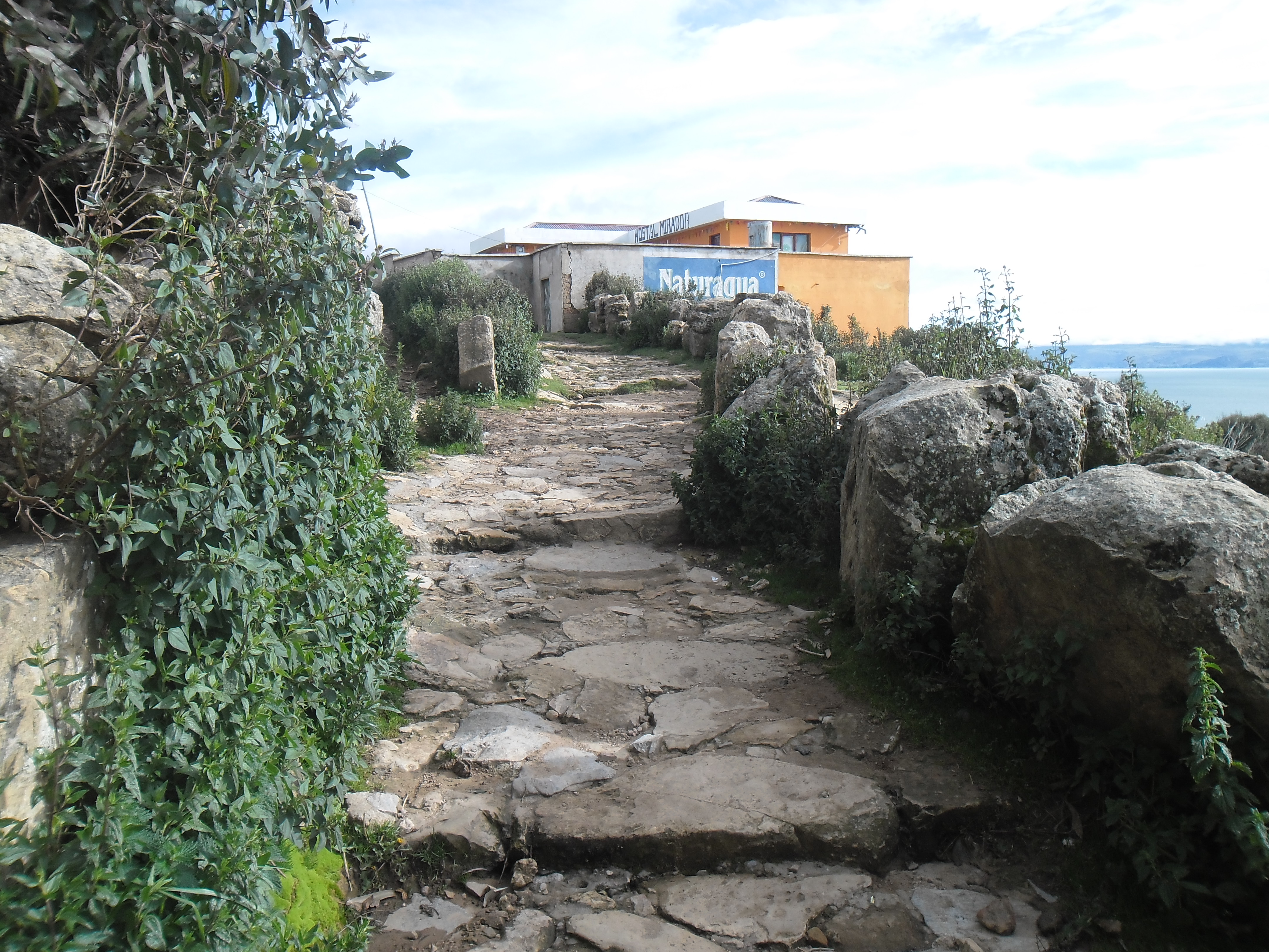 It’s an hour and a half boat ride to the island from the town of Copacabana, Bolivia. The island is pretty small. It’s about ten kilometers long, three kilometers wide. It rises steeply (to say the least) out of the water, and its ridge is 1000 feet above the lake. There are no roads on the island. There are no vehicles on the island. Neither are there (obviously) any stop signs or traffic signals. Neither are there any banks or credit cards, no internet, no telephones (except for personal cell phones) no police. Electricity arrived about ten years ago. The matter of cell phones is interesting, because often you see an ancient indigenous woman, for example, walking down the trail with her sheep like they have done for a thousand years, talking on her cell phone.