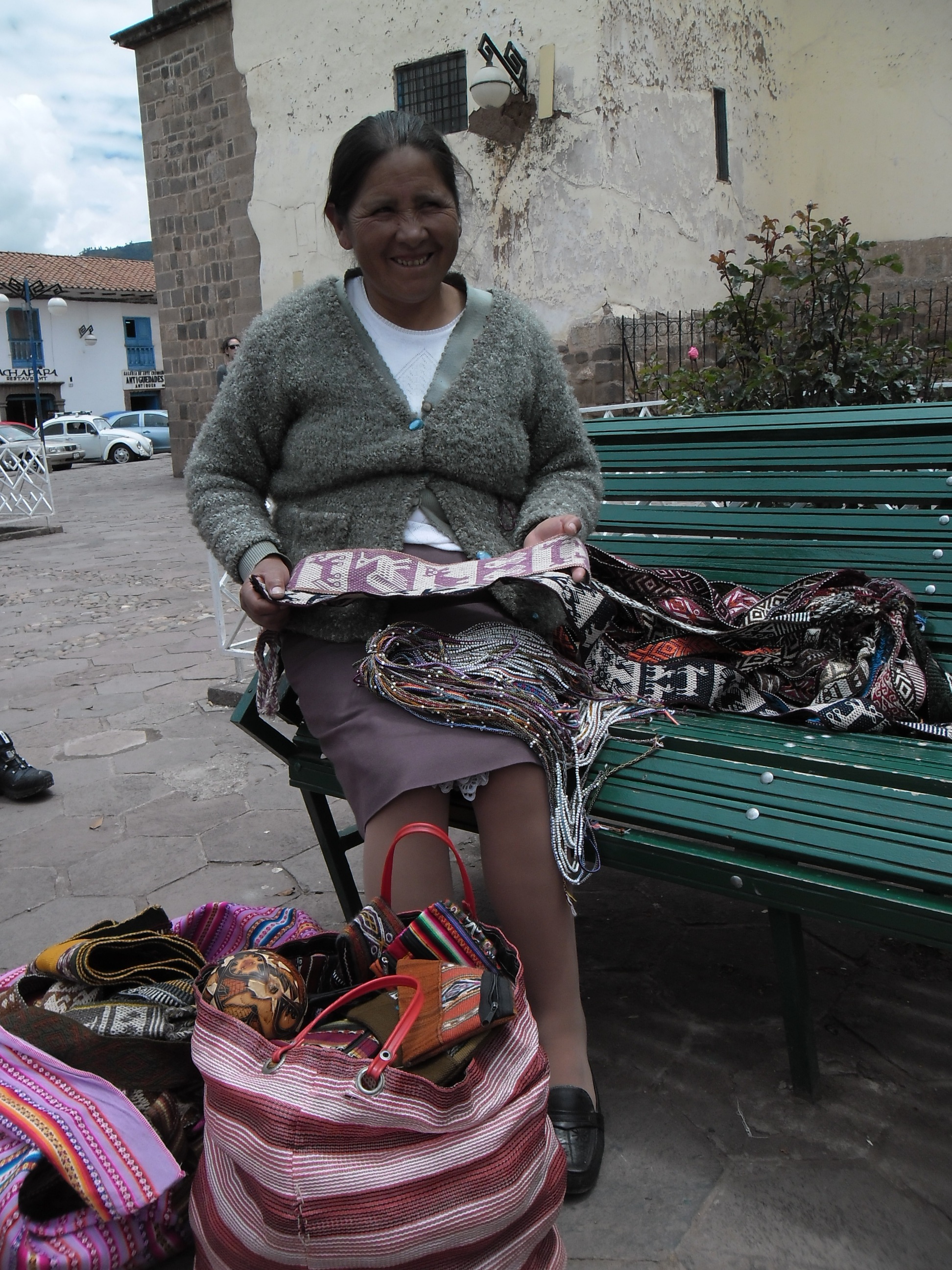 SAM_0107SAM_0106SAM_0181Cusco is vibrant. It is a mix of ancient and modern. Colonial and indigenous. There are people here from all over the world. There is a mix of cultures and an acceptance. Good restaurants. Good coffee. The local people talk to the tourists. This can be good and bad. On the one hand, it’s easy to meet and talk to people. On the other hand, there are seemingly thousands of people out on the street who are hoping to sell you something. Guys with paintings, women with jewelry or weavings or sculpted gourds. They see you and come after you. “Looking is free.” “Please buy something from  me.” “I make you a good price.” “Look how beautiful.”  If you sit on a bench in the main square, you will be approached. Some of the vendors can get quite insistent. Sometimes it can get a little infuriating. We bought some things, and a few times, we just gave some money without buying anything. It’s all such a delicate balance.