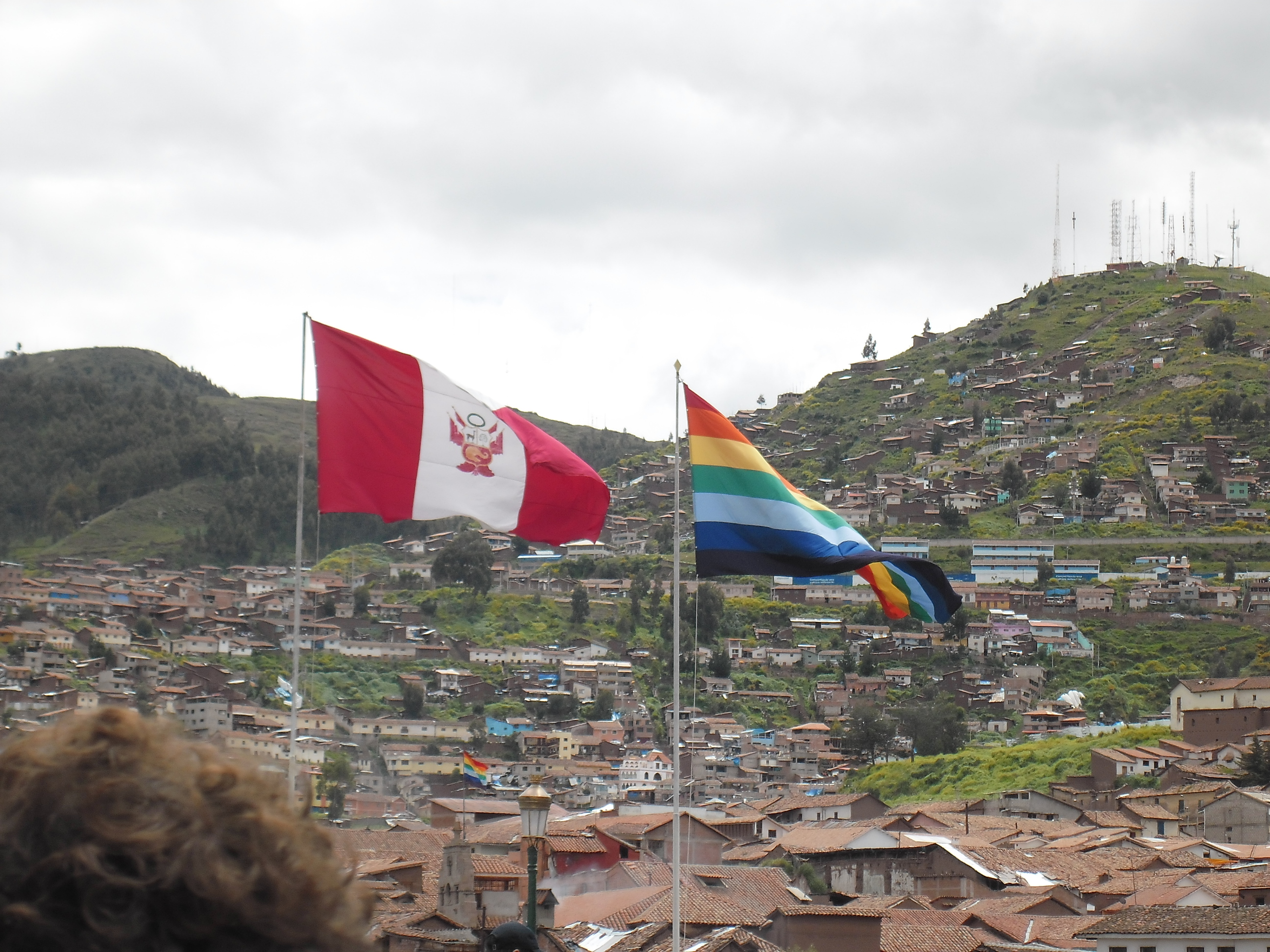 The Peru flag is on the left. The Cusco flag is on the right. The rainbow flag flies over all the government buildings.